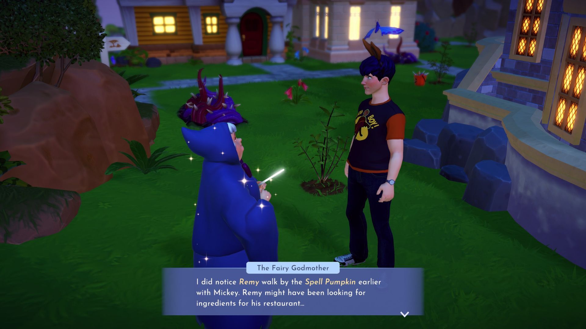 Now, go to Remy’s Restaurant and retrieve the Spell Pumpkin. After you have it, return to the Fairy Godmother. She’ll let you know that with the Spell Pumpkin in hand, you can bring Cinderella to the valley.