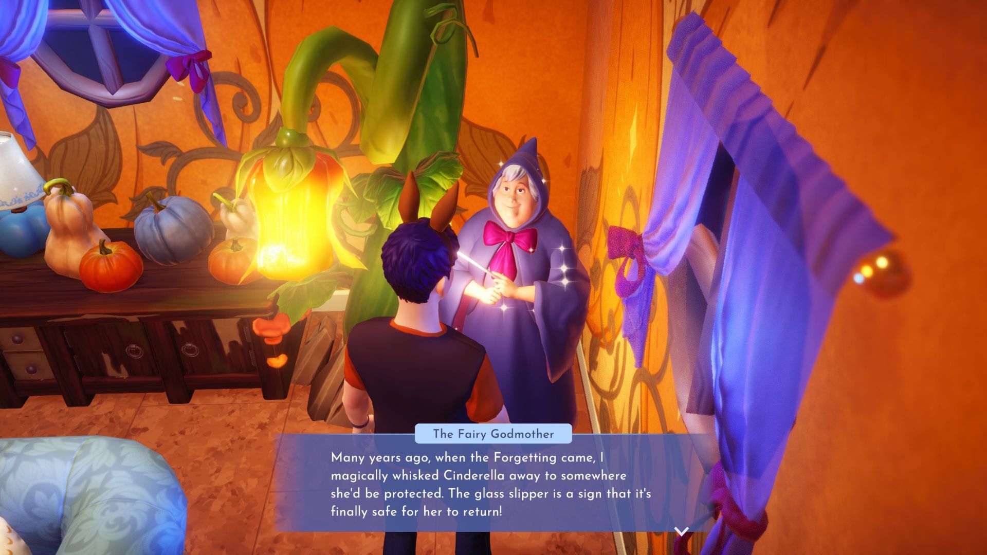 The Fairy Godmother reveals the glass slipper belonged to Cinderella. She explains that when everyone’s memories were erased, she protected Cinderella by hiding her. To bring Cinderella back, you’ll need a special pumpkin, but first, you have to create a Wish Enchantment to grow it.