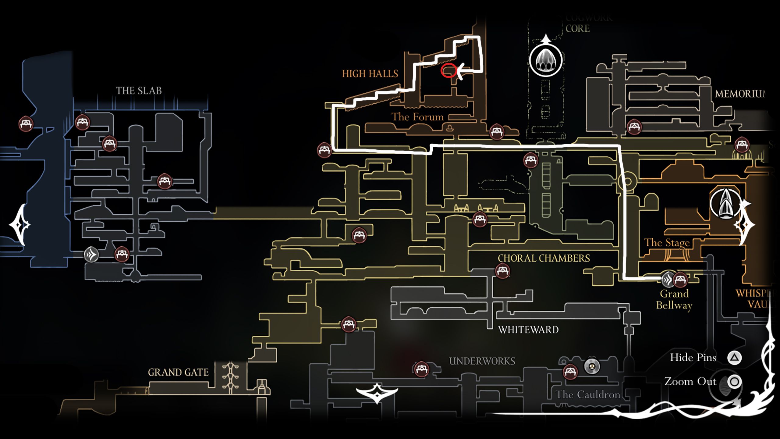 Starting from the manager’s office, take a left and continue walking in that direction until you spot a bench. Jump twice to reach the bench, then use it as a launch pad to shoot your harpoon at the hanging rings. This will help you gain altitude. Repeat this process using all the available rings to ascend to the top. After that, move right to enter a spacious room with water flowing horizontally and multiple platforms. As Hornet is now in the High Halls, navigate through this area by jumping on the platforms and grabbing onto the rings as needed to progress to the next chamber.