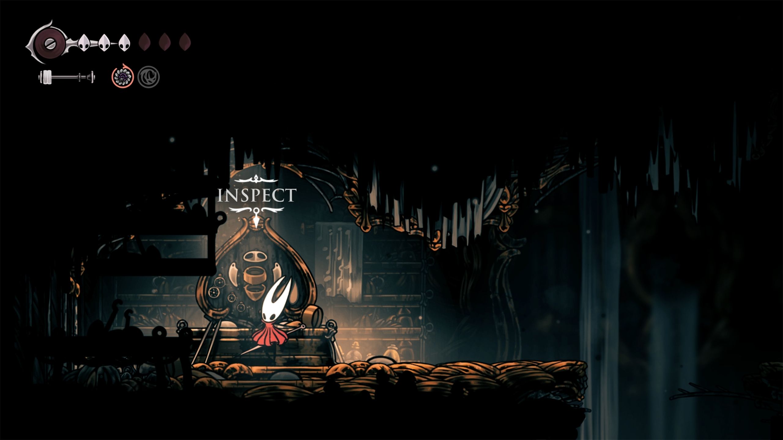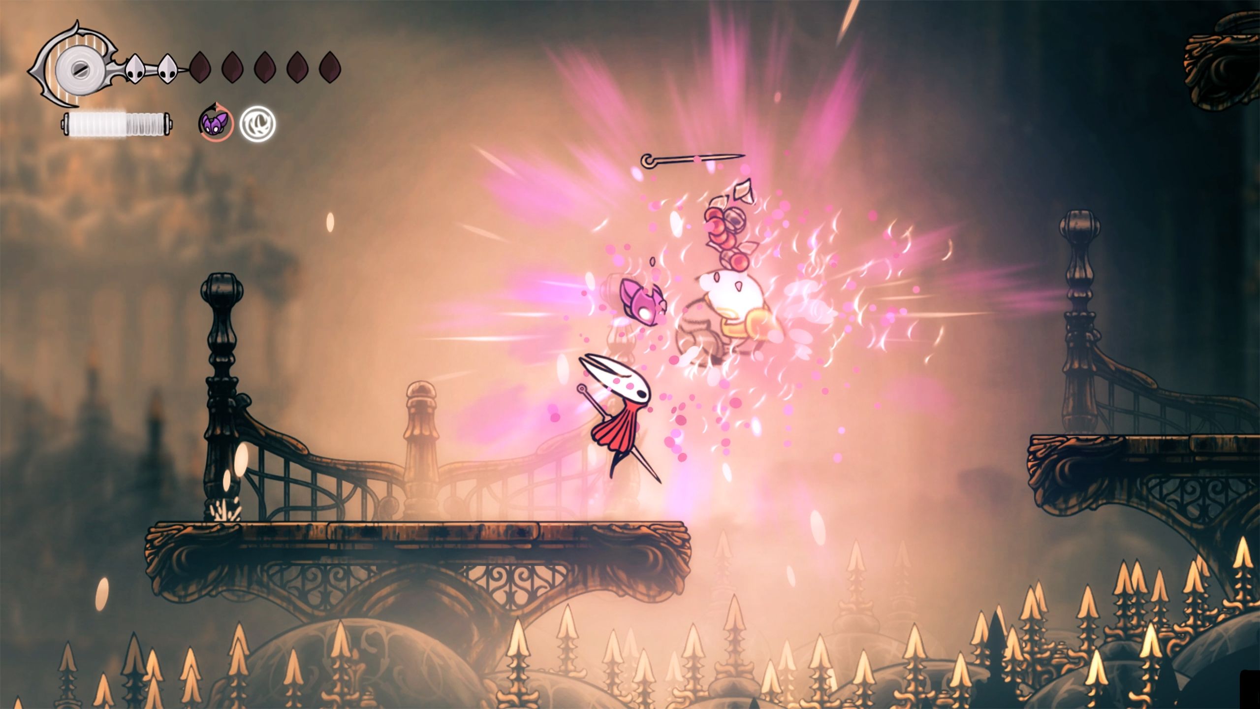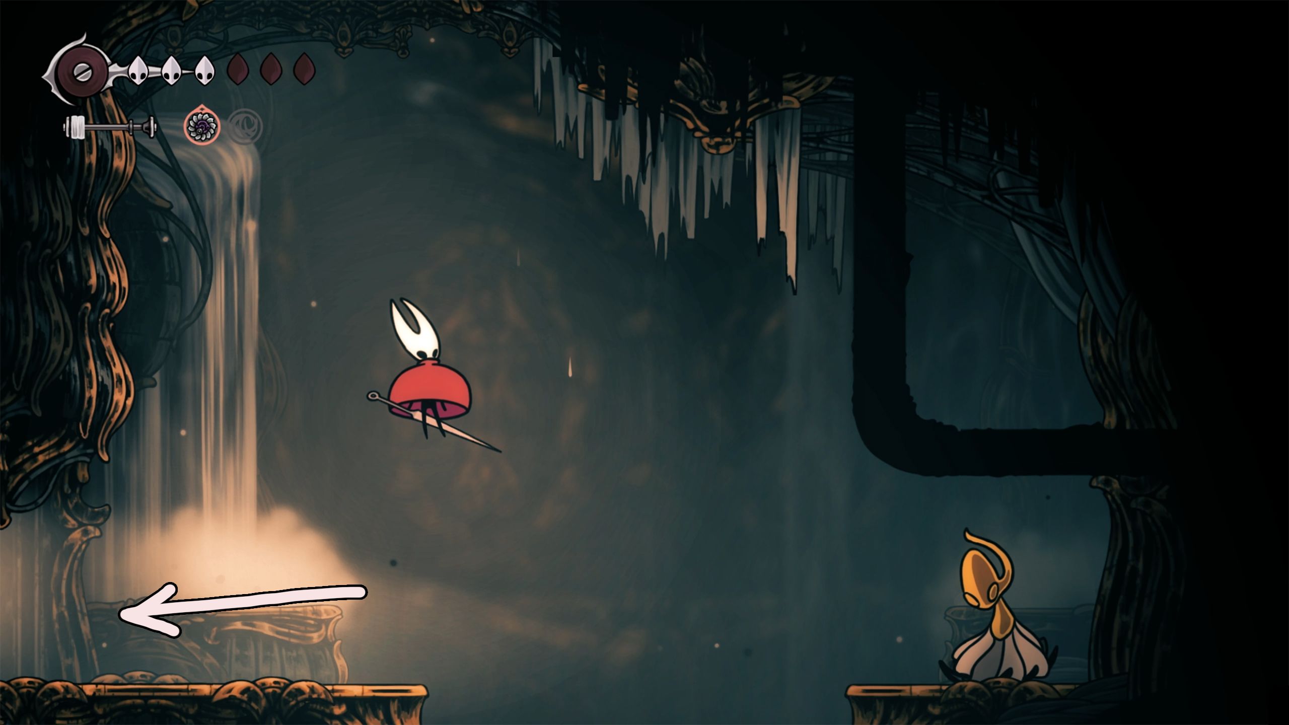 Peer below, slide smoothly past the sharp protrusions, and swiftly grab hold of the ring when you reach it. This action will eliminate the spiky barriers, revealing a descent route below. Proceed moving down using this same method and Hornet will ultimately discover an adversary positioned to the left along a nearby path.