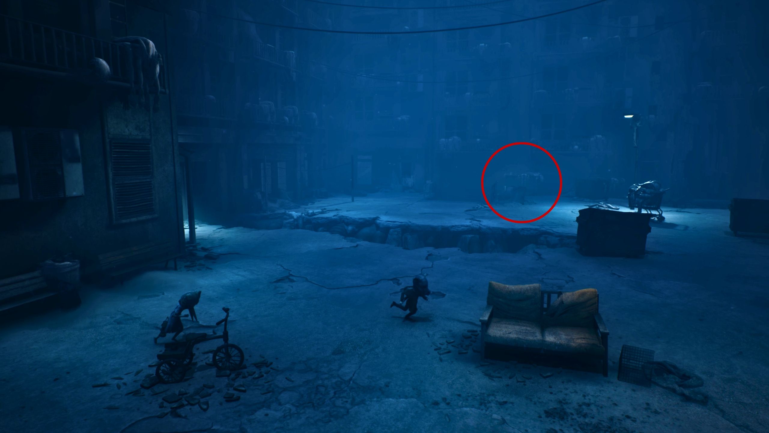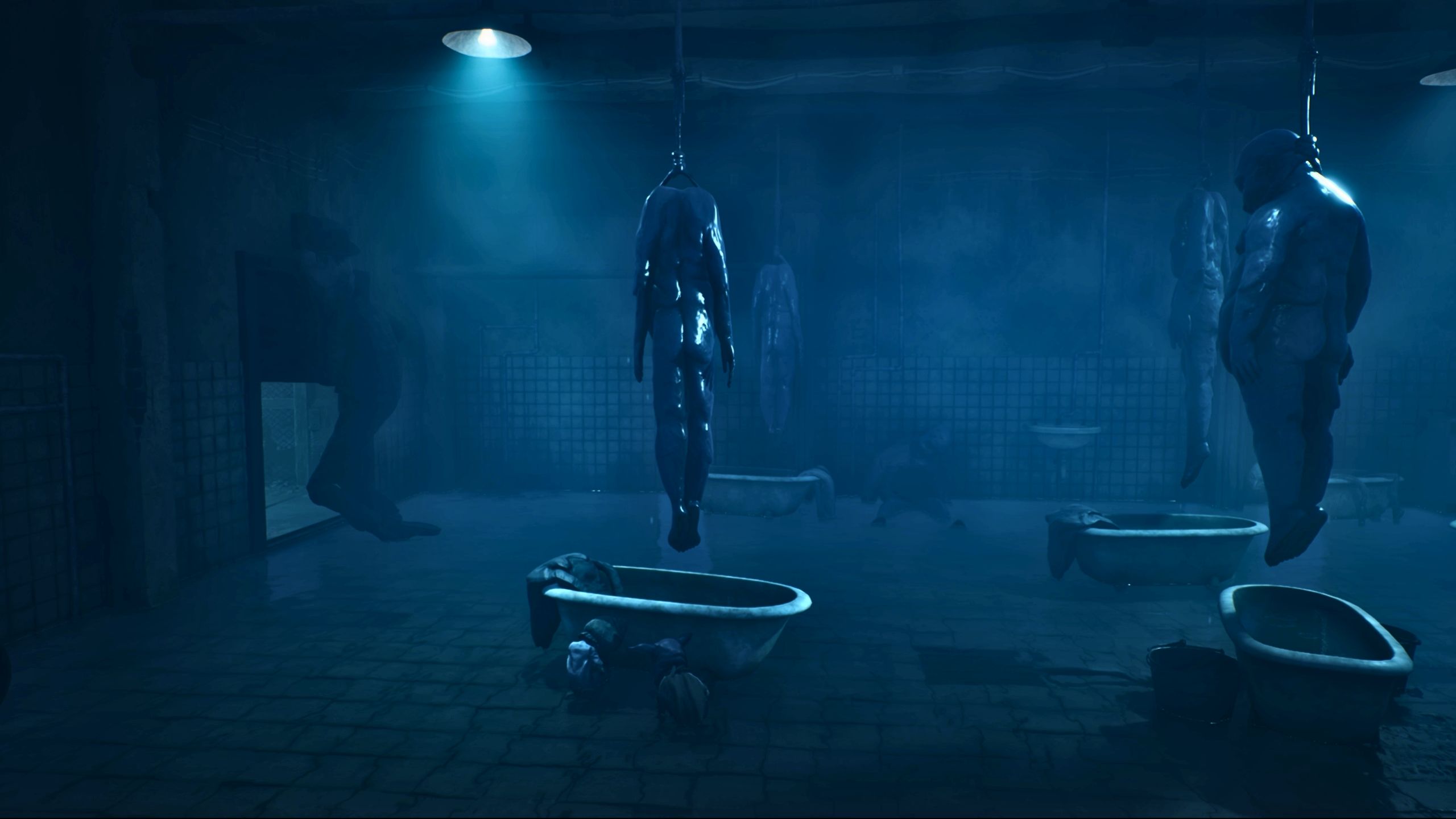 You’ll find a room with skins hanging from the ceiling above the bathtubs. Your goal is to hide behind those bathtubs to avoid the Sniffer. Stay hidden long enough, and it will lose your trail and move to the next room, accidentally opening the door for you to proceed.