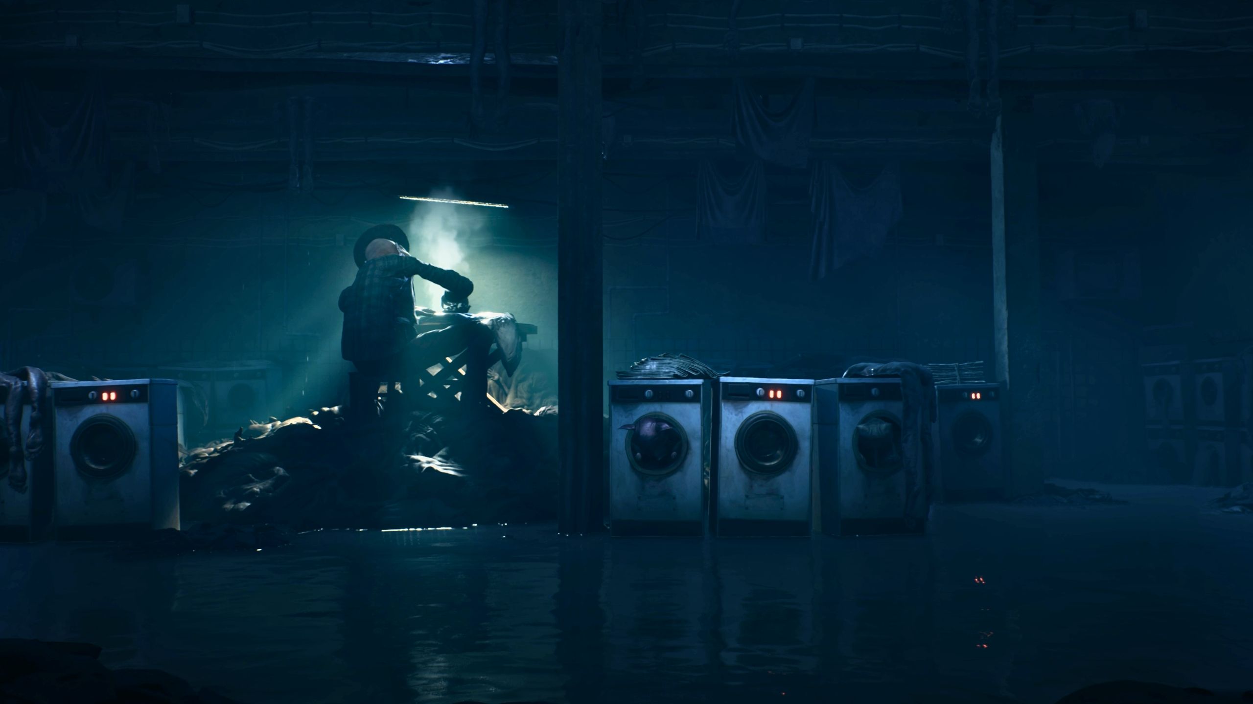 The window opens into a room containing washing machines and the Sniffer, who appears to be ironing what looks like a new suit. Carefully sneak through this room, staying low to the ground so you don’t alert the Sniffer. If he notices you, quickly hide inside one of the washing machines that isn’t being used. To continue, look for a vent next to the door on the left side of the room.