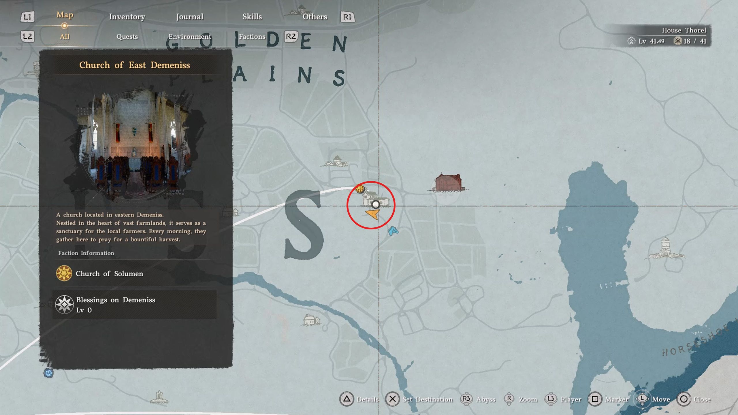Go to the Church of East Demeniss, located southeast of the Golden Plains and east of the second ‘S’ in ‘Demeniss’ on the map. The easiest way to get there is to use a nearby Abyss Nexus and then follow the dirt path.