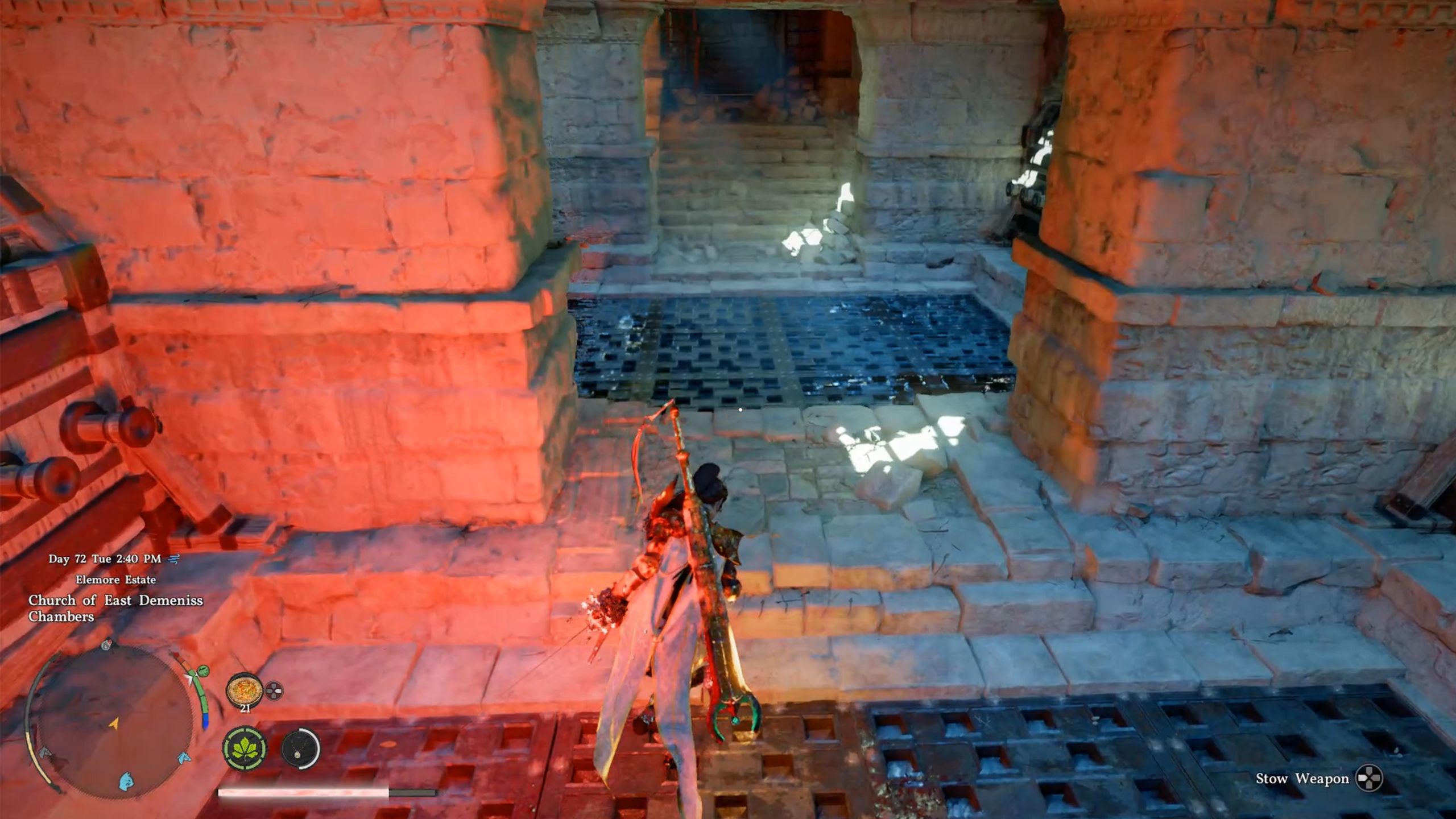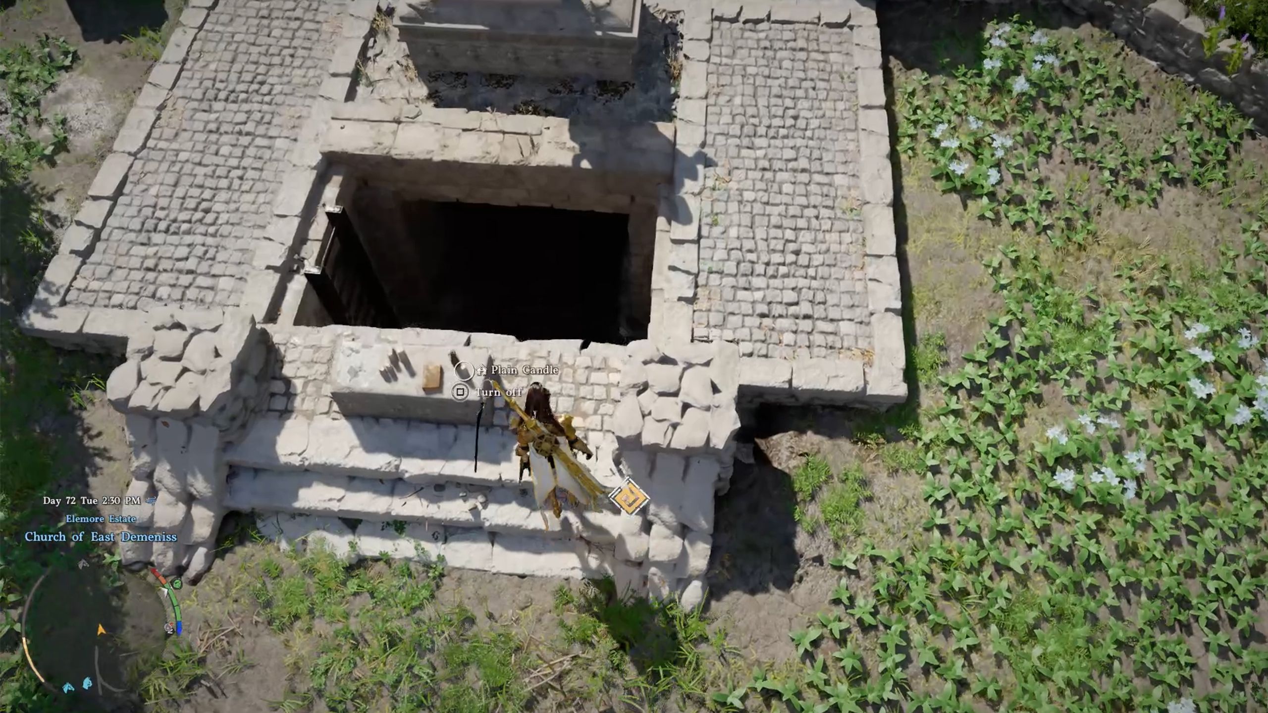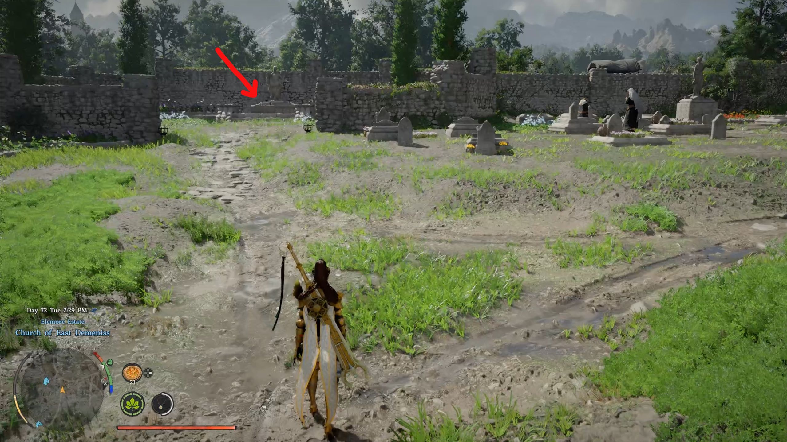 When you get to the church, head west and go into the area by the tombstones. You’ll find an opening in front of the statue. Use the ladder to climb down, or simply jump, to enter the Church of East Demeniss Chambers.