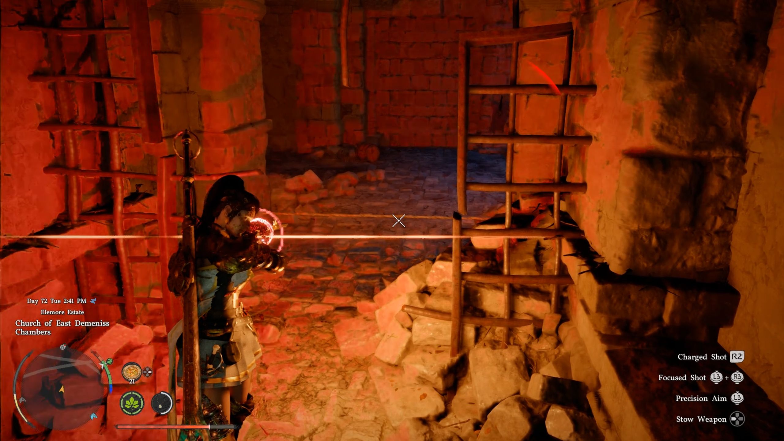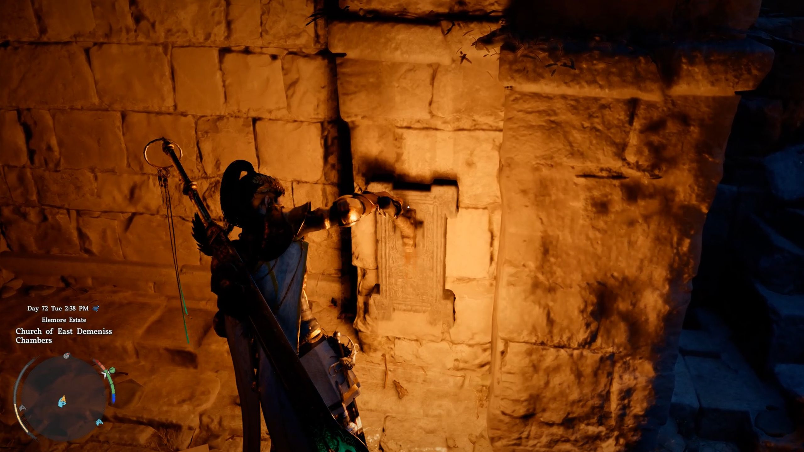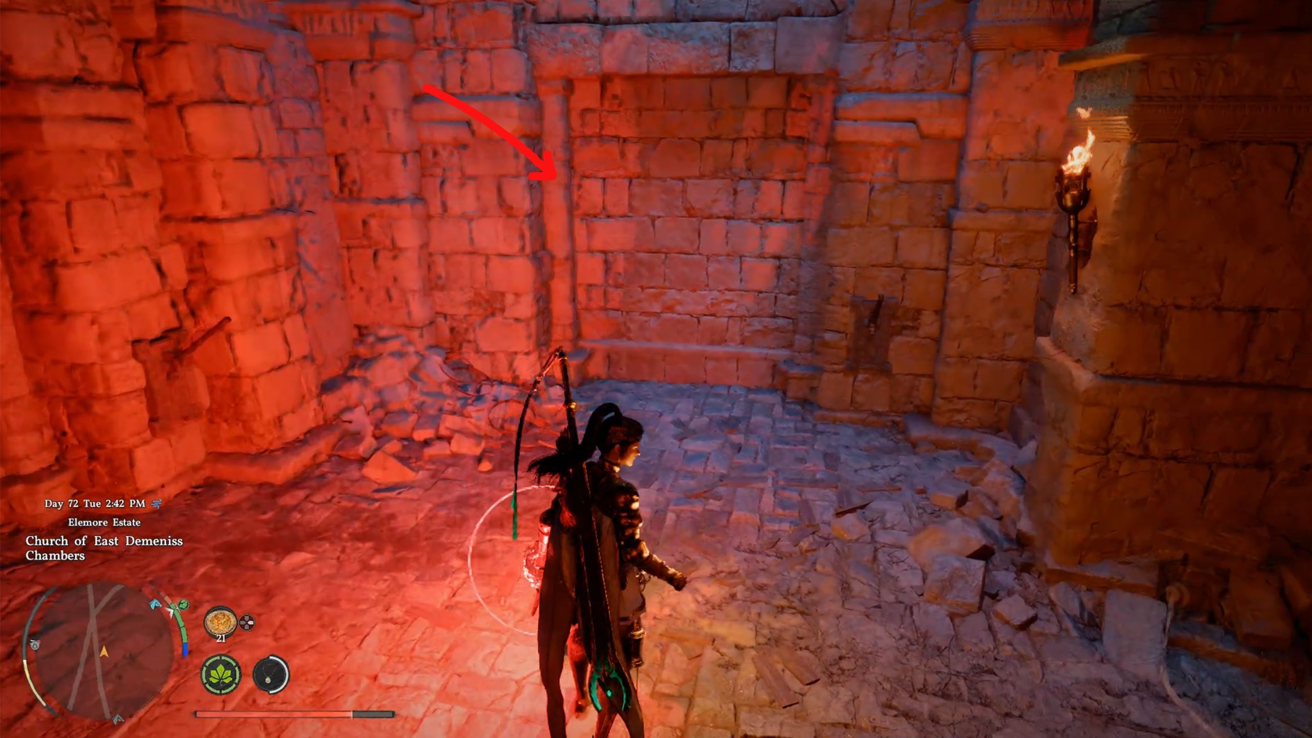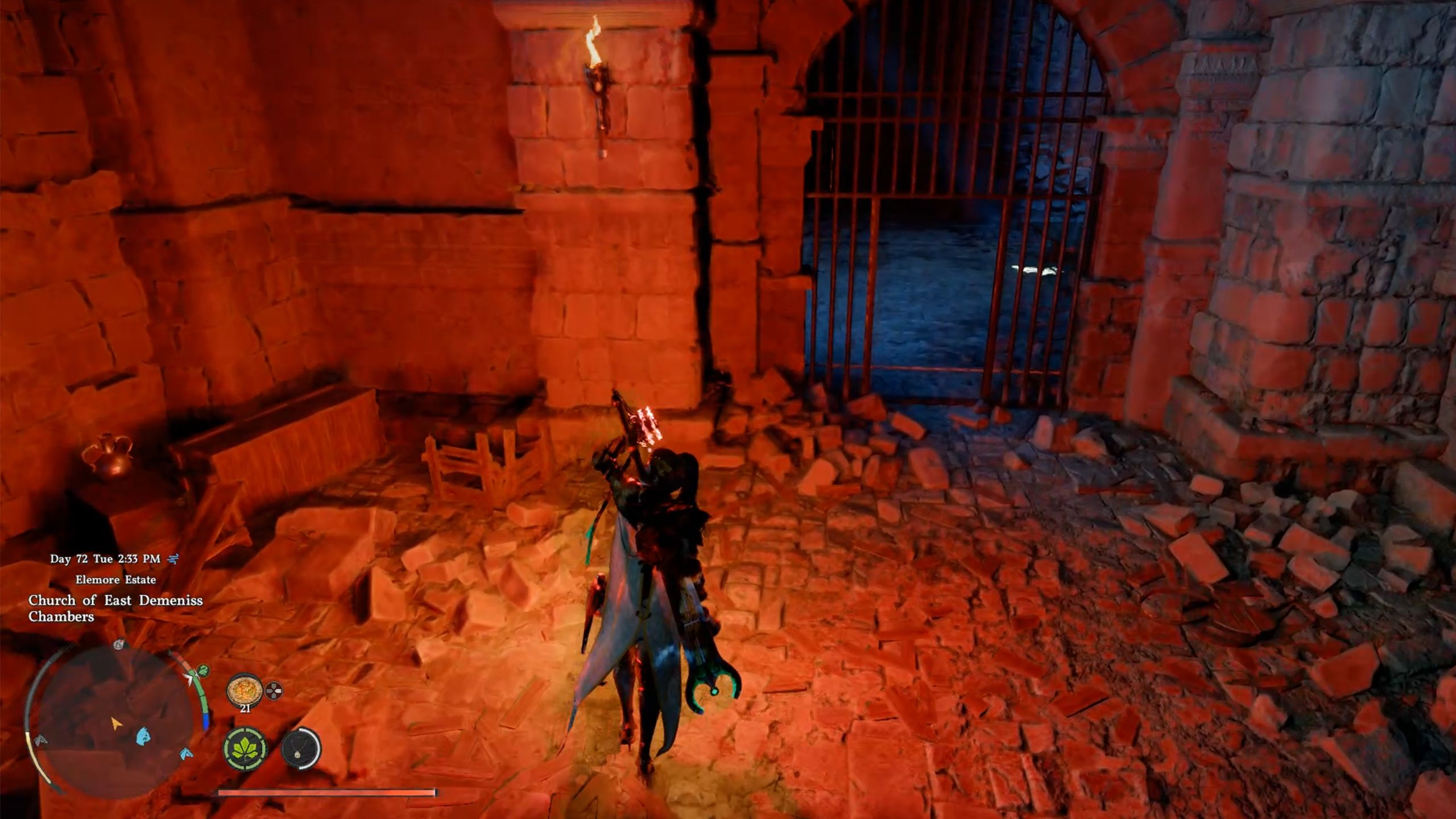 When you get to the church, head west and go into the area by the tombstones. You’ll find an opening in front of the statue. Use the ladder to climb down, or simply jump, to enter the Church of East Demeniss Chambers.
