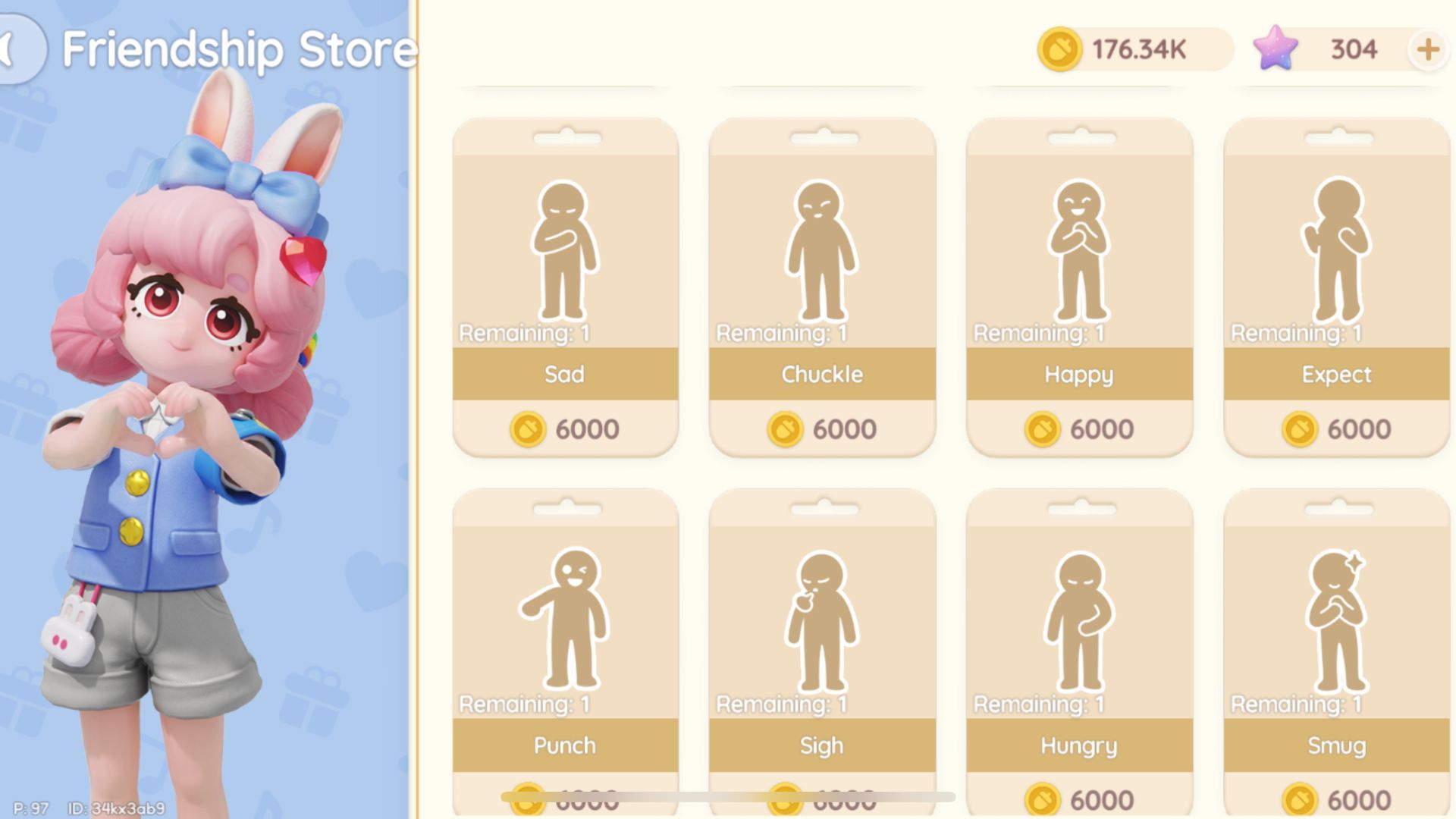 After you start a conversation with her, go to the chat menu. Select “Store,” then choose “Friendship Store.” This is where you’ll find all the emotes and solo actions available. You can browse through them, check the prices, and purchase the ones you want.