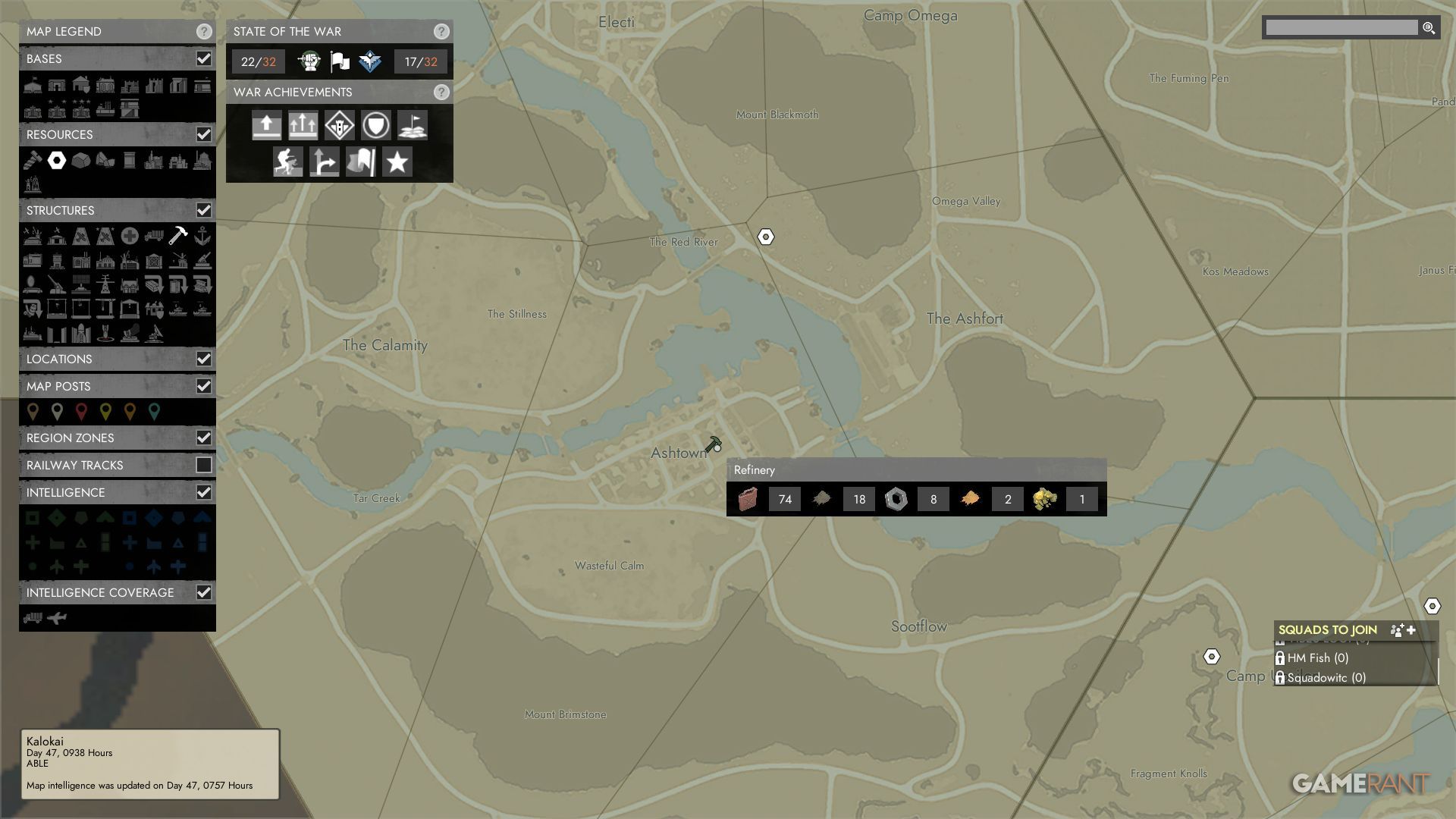 On the map, component fields are shown as white, six-sided nuts. Refineries are represented by hammer icons.