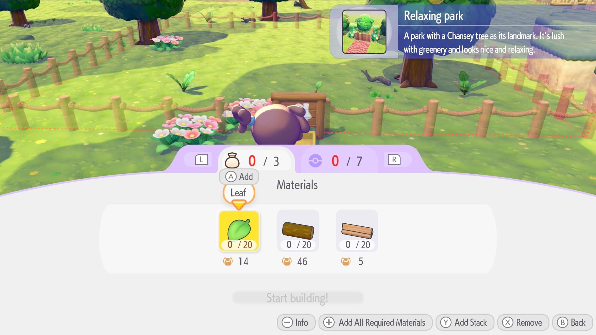 To build the Relaxing Park kit, you’ll need 20 Leaves, 20 Wood, and 20 Lumber. Building the park does require a lot of materials, but these are generally easier to find than rarer resources like Pokemetal.