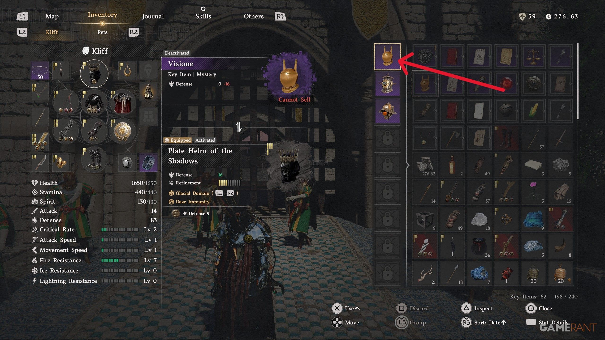 - You can find the Visione in your inventory as the brass helmet in your Key Items.