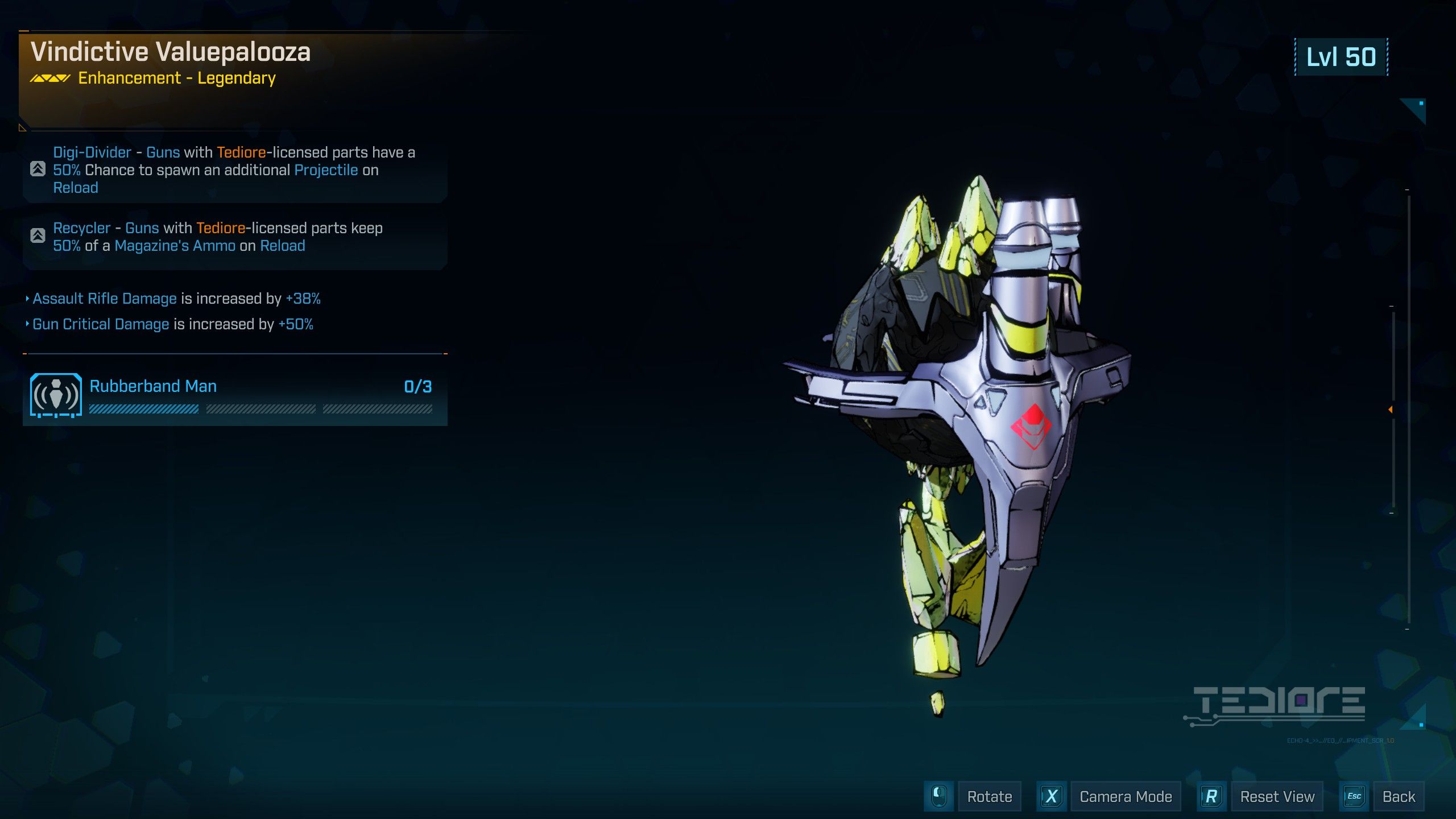 Tediore | Digi-Divider – Guns with Tediore-licensed parts have a 50% Chance to spawn an additional Projectile on Reload Recycler – Guns witH Tediore-licensed parts keep 50% of a Magazine’s Ammo on Reload Extend-a-Friend – Guns with Tediore-licensed parts have a +50% longer Lifetime for Thrown Turrets |