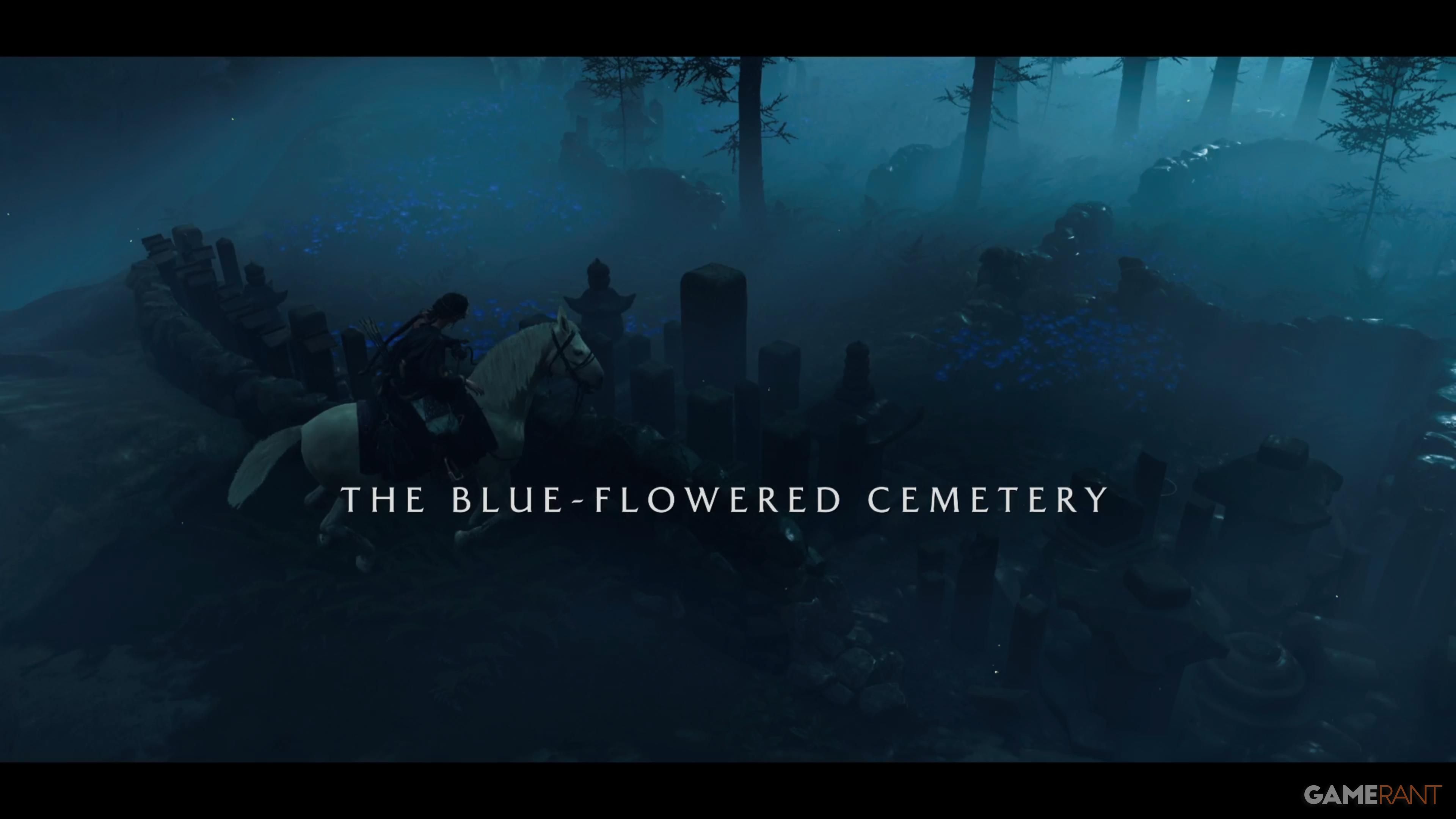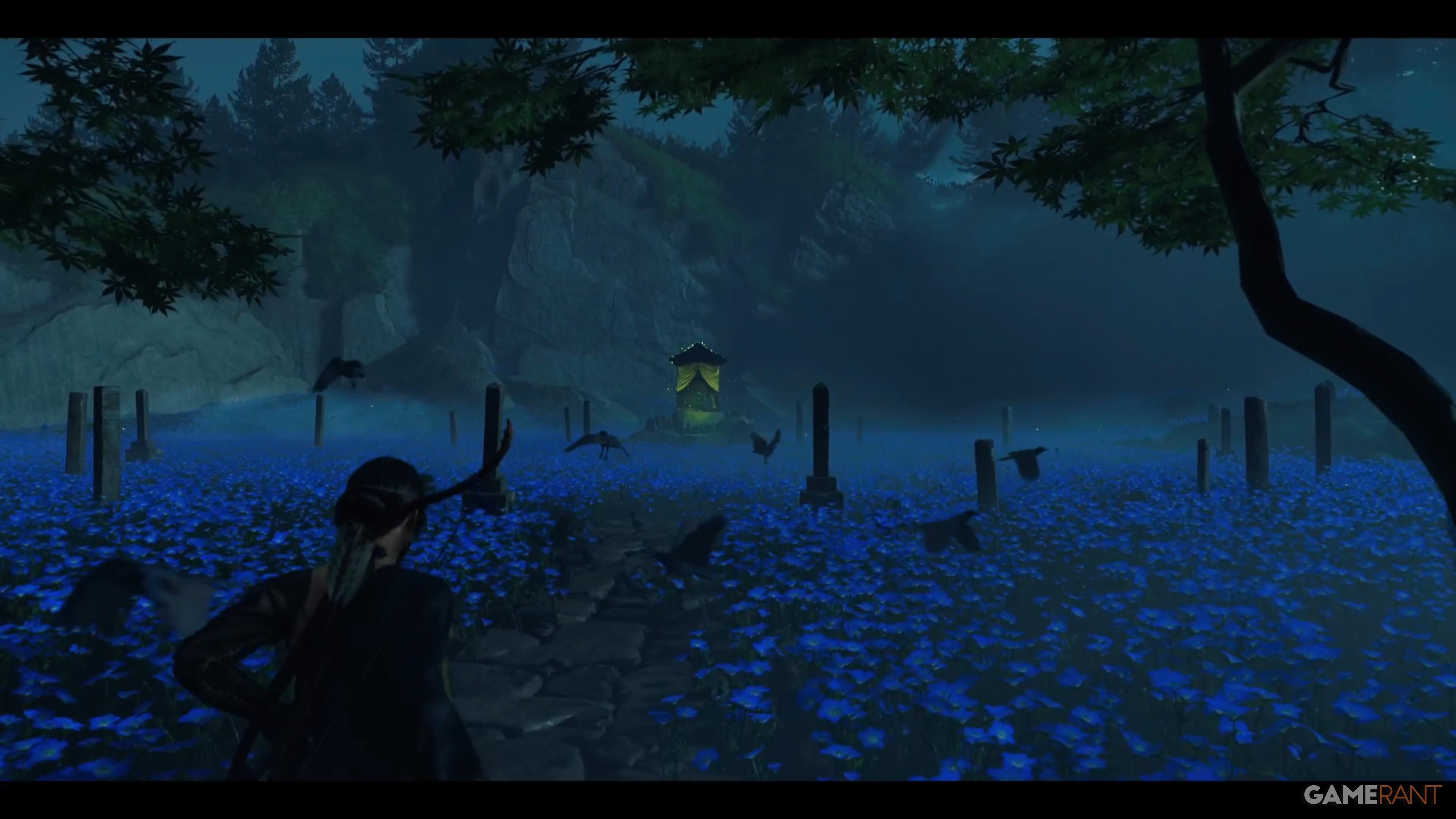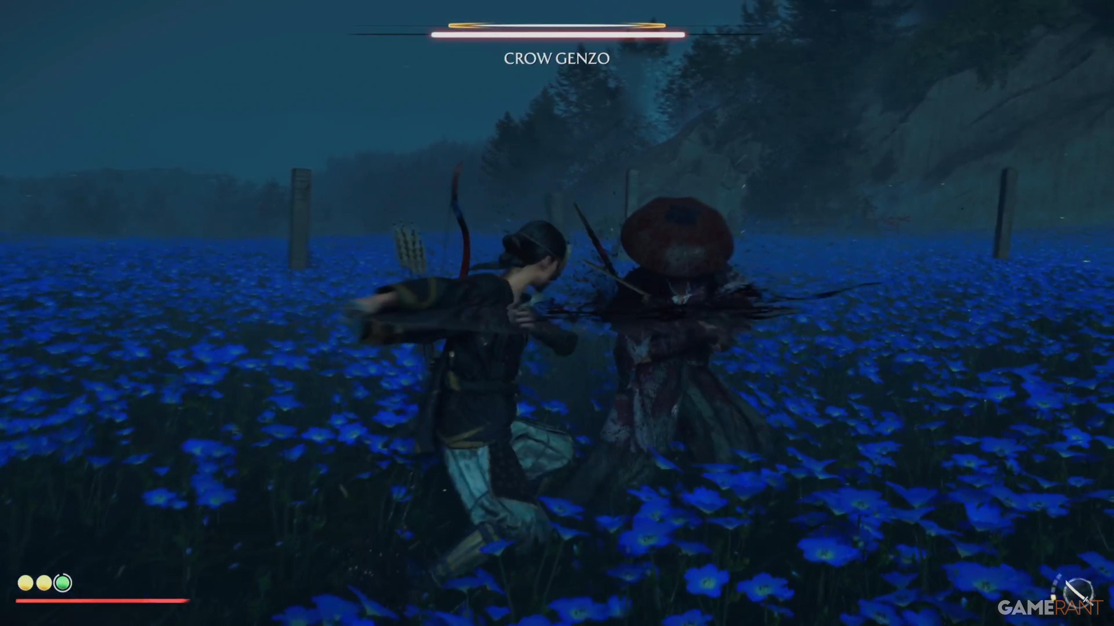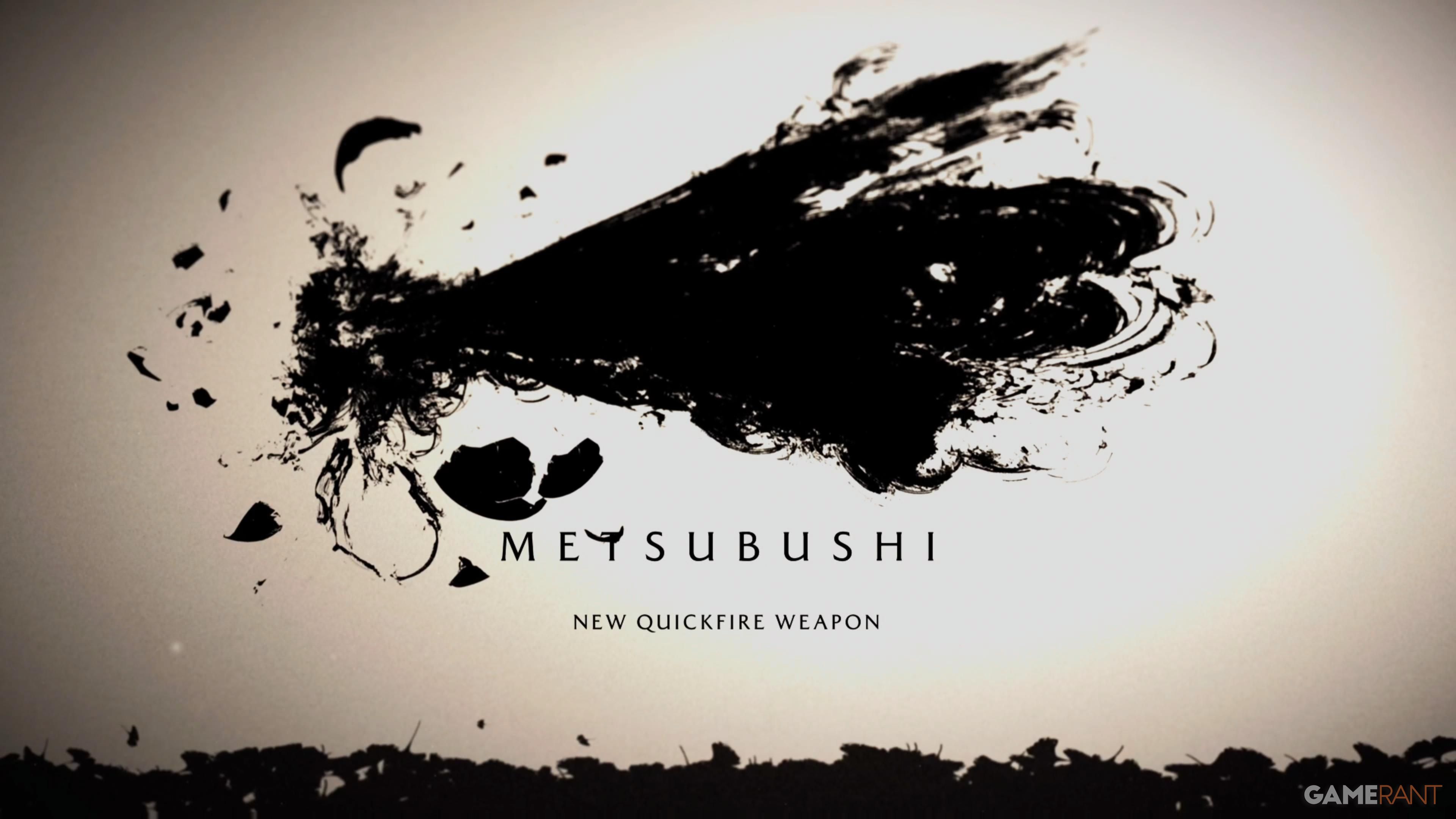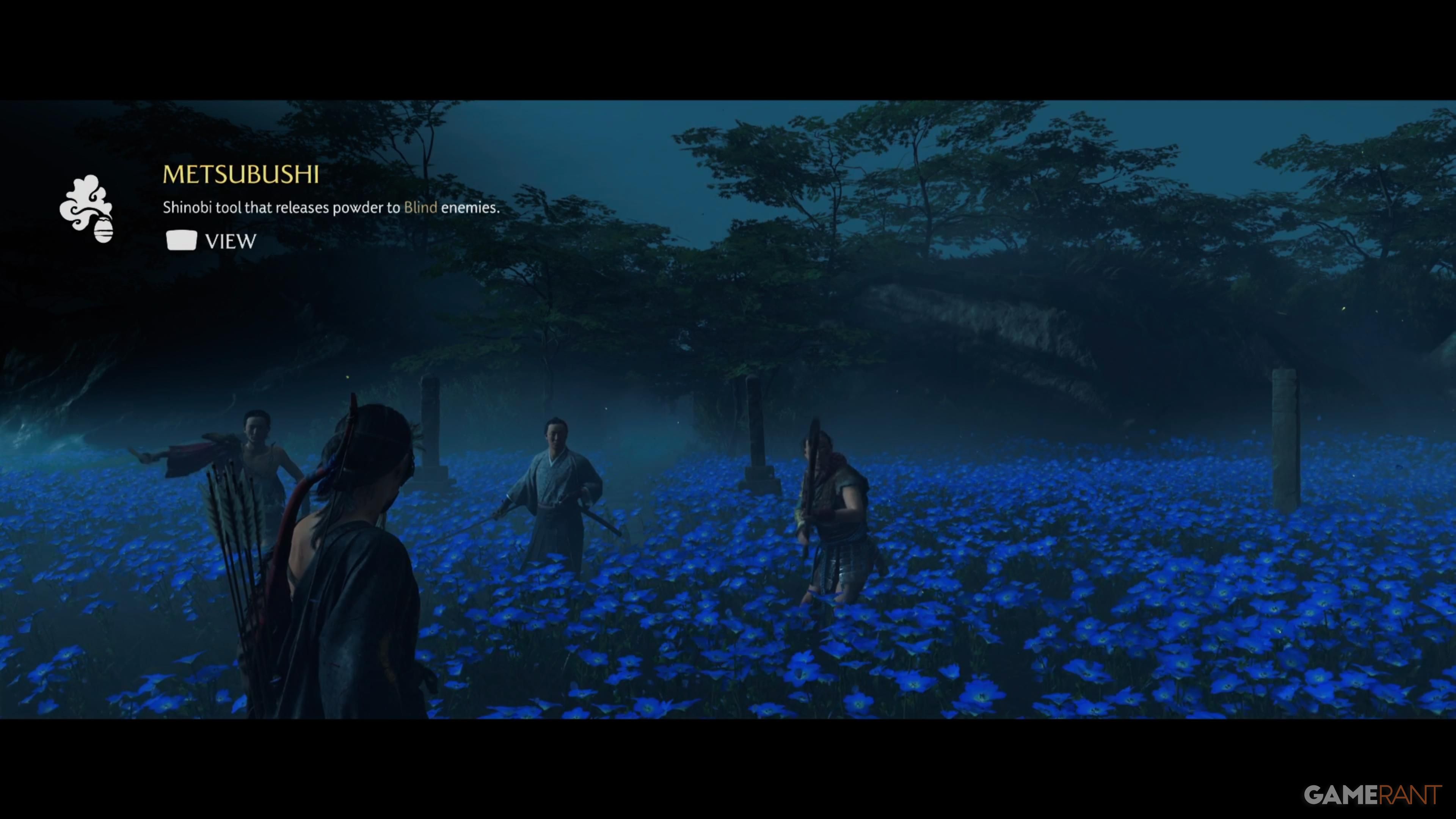 It doesn’t matter if you make camp here or not, you can begin traveling North from this spot and will quickly reach the Blue-Flowered Cemetery. Enter and walk straight ahead toward the Altar that you see. There, you’ll face Crow Genzo in a solo battle. If you win, you’ll receive the Metsubushi, which is a type of Quickfire Weapon.