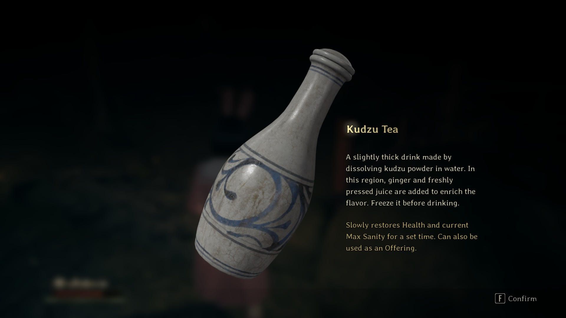 Kudzu Tea | 100 | Gradually restores Health and Max Sanity over time. |