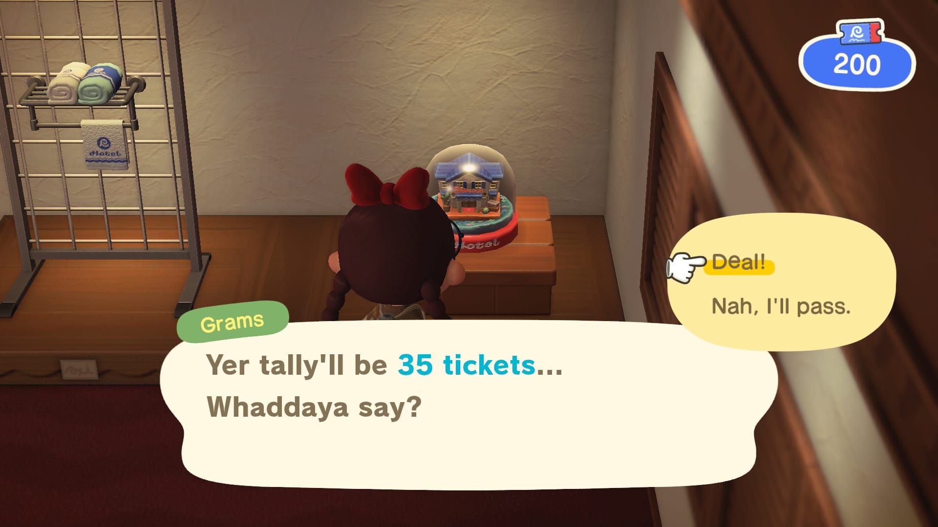Just like with Nook Shopping, there’s a limit to how many items you can order from the hotel’s souvenir catalog. You can ask Grams to order up to five items each day. But, because this limit applies per player account, you can get more items if you have a second account and log in to it.