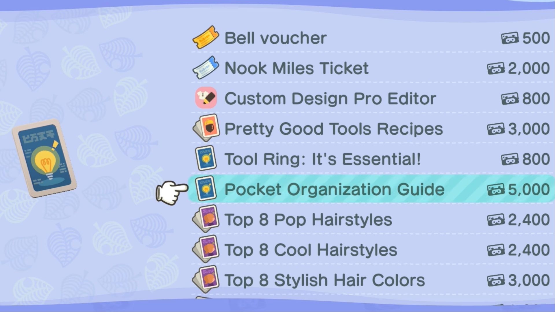To expand your inventory for the first time, you’ll need to buy the Pocket Organization Guide. This item appears at the Nook Stop in Tom Nook’s tent once you’ve paid off your initial loan of 5,000 Nook Miles.