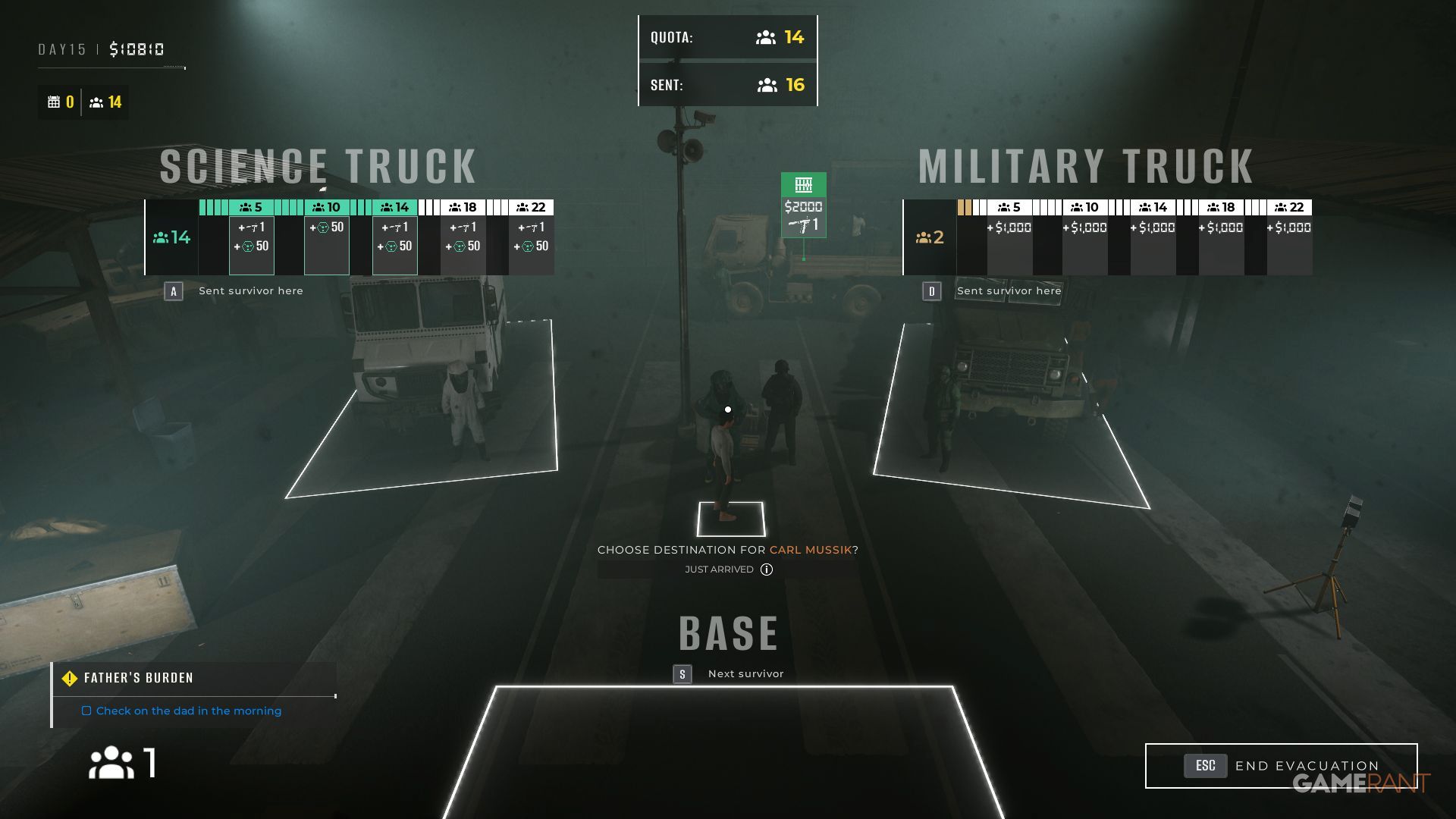 When evacuating survivors, it’s better to send them to the science team instead of the military. The science team will give you Research Points and Syringe Analyzers as a reward, which are more valuable than the cash you’d get from the military.