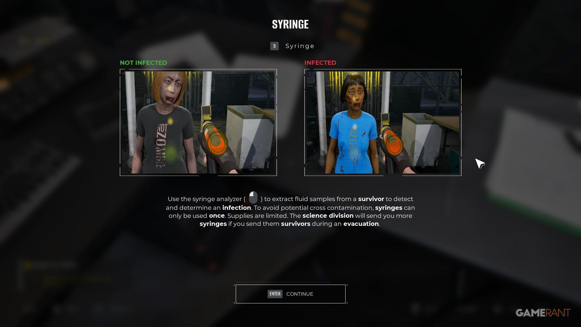 Syringe Analyzers are rare, so use them wisely. Don’t waste one by testing a survivor for every possible symptom beforehand. If you find even one red symptom without using a syringe, you can eliminate the survivor immediately, saving your limited supplies.