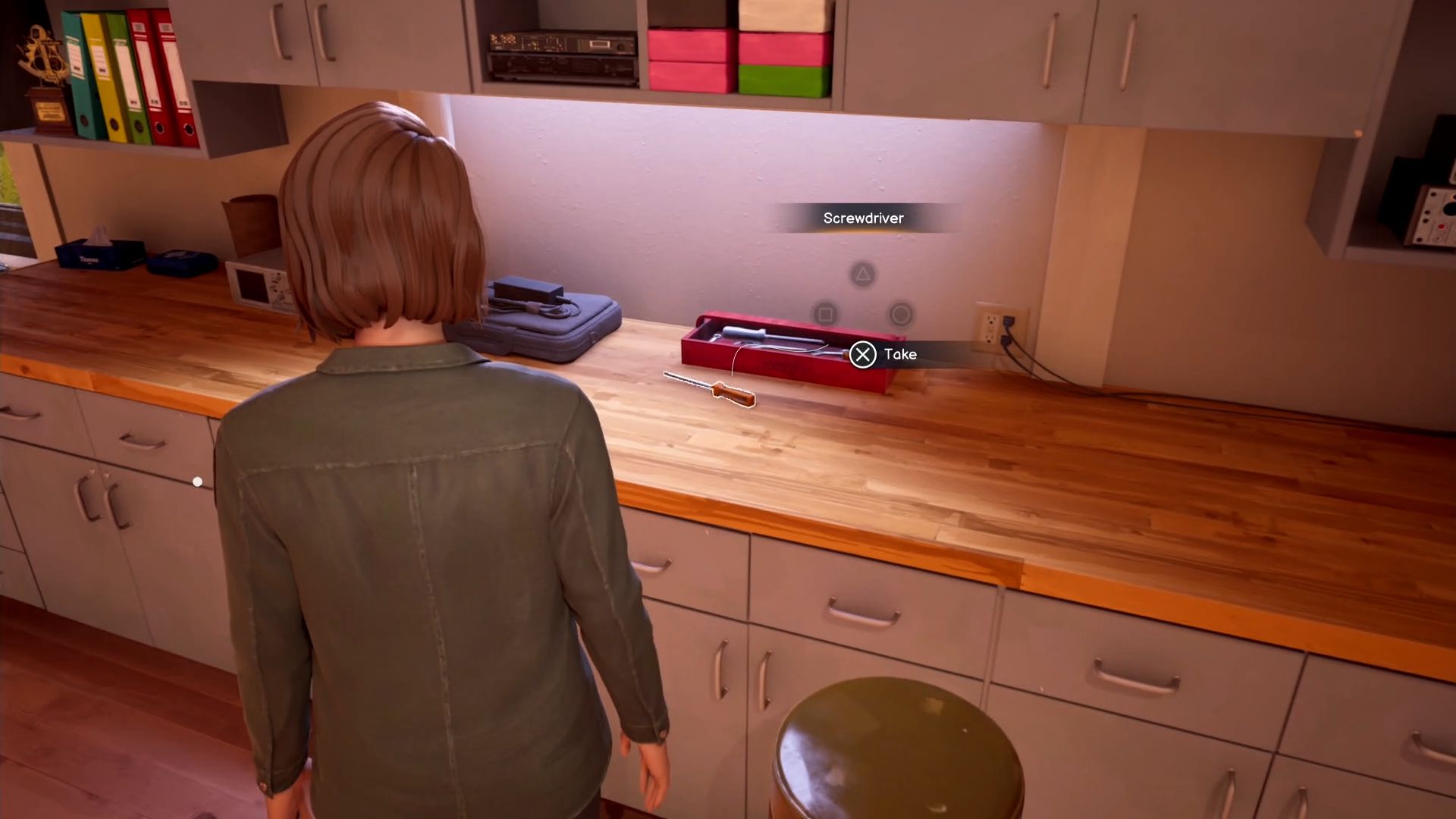 First, grab the screwdriver from the bench above the locked cabinet – it’s near a toolbox, slightly to your right. If you can’t find it, rewind time and check again. Once you have it, use the screwdriver on the cabinet. However, simply opening the cabinet isn’t enough, because the mug inside breaks every time, even if Max rewinds time knowing it will happen.
