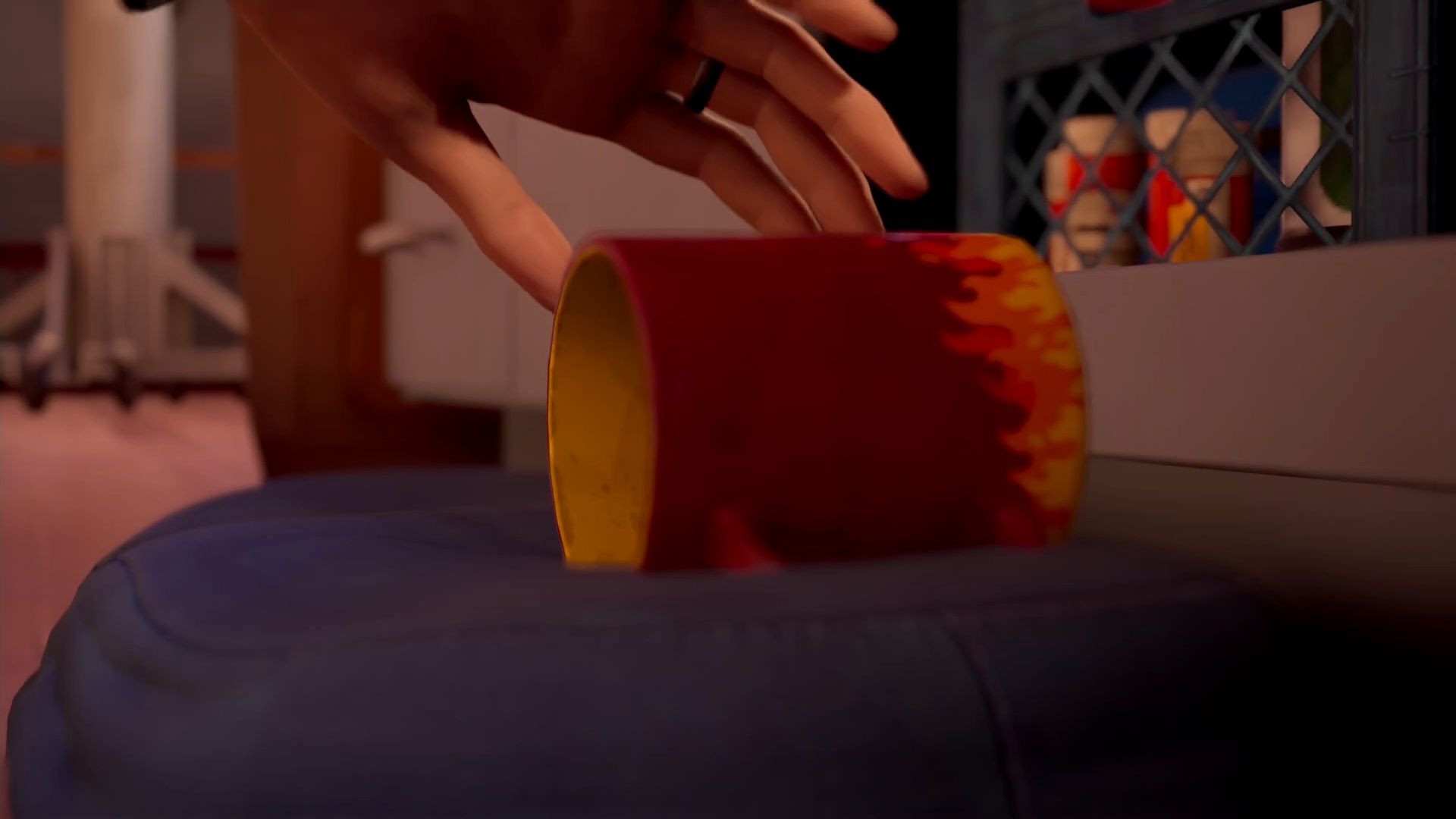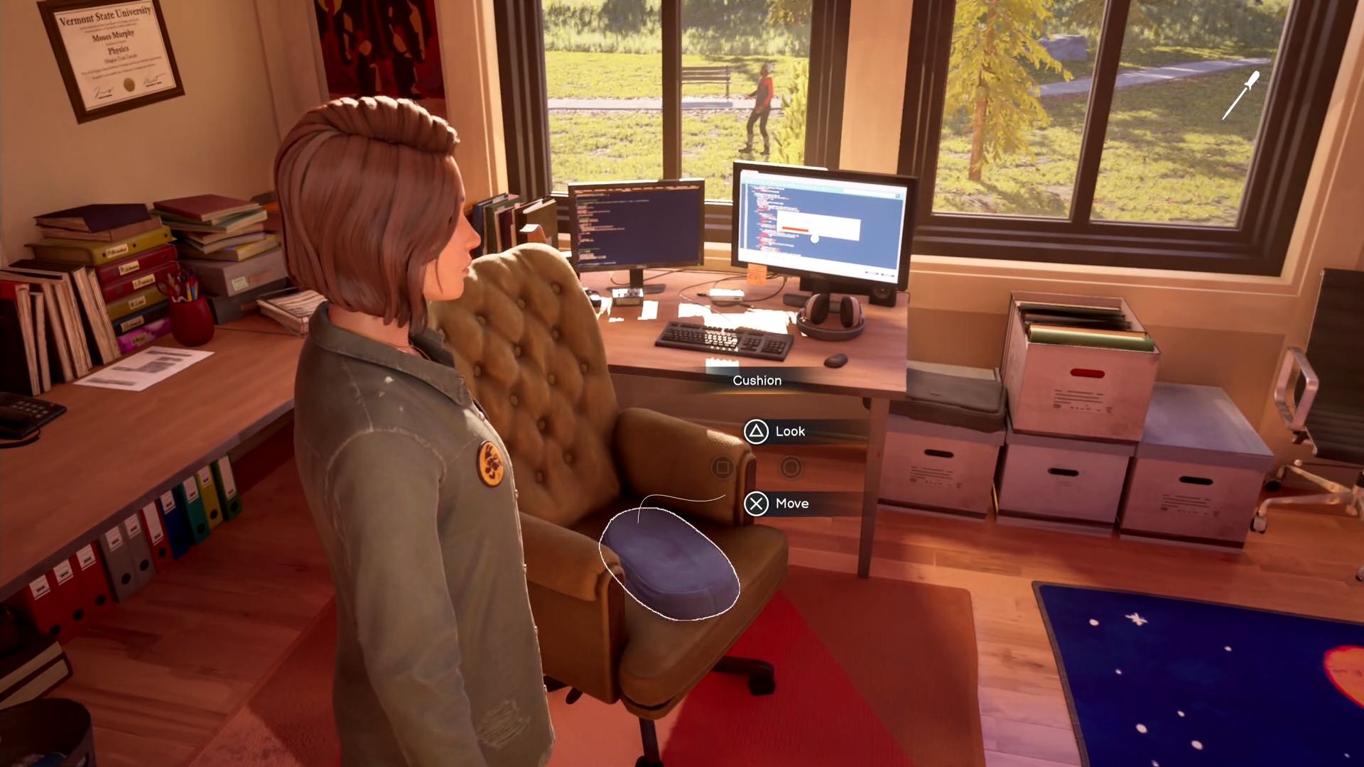 To prevent the mug from breaking, grab the cushion from the chair near Moses’ computer. It’s right across from where he’s standing, next to his PC. Once you have the cushion, Max can unlock the cabinet and let the mug fall safely onto it.