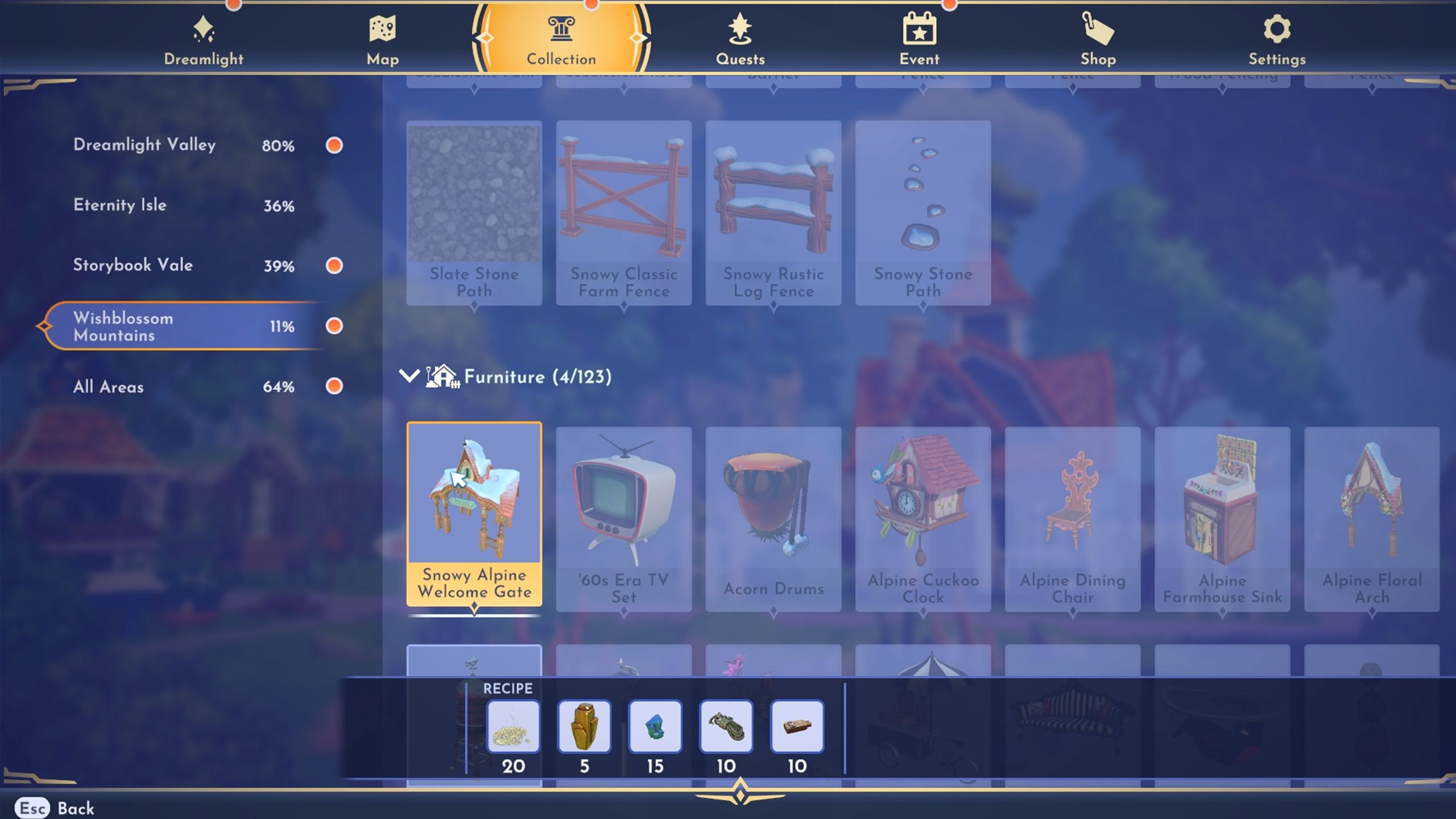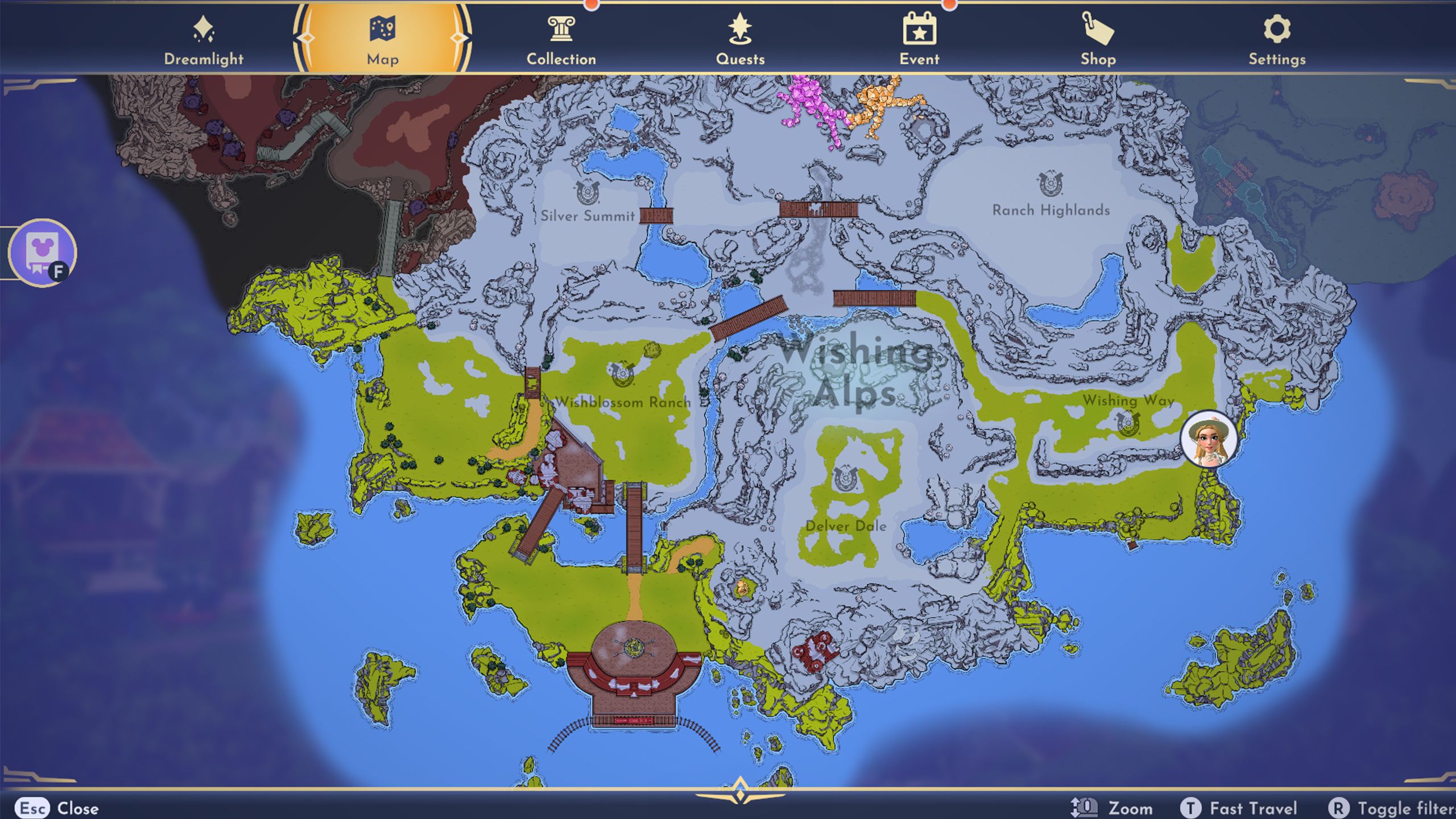 The Wishing Alps is a large area with several distinct locations to explore, including Wishblossom Ranch, Wishing Way, Delver Dale, Ranch Highlands, and Silver Summit. Players may need to gather resources and complete tasks, like building something or helping Maximus, to reach all parts of the Alps, as some areas are initially blocked off.