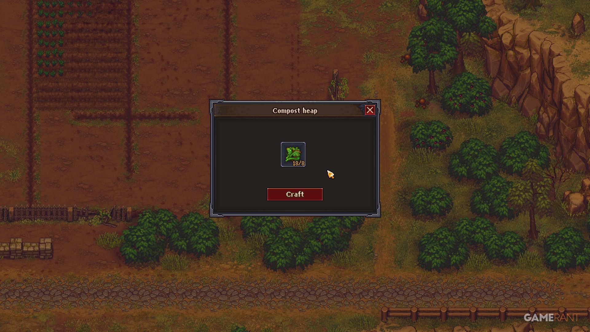 Once your Compost Heap is built, you can use it to turn Crop Waste into compost. You can add up to 8 Crop Waste at a time. It takes a while for the composting process to finish—much like cooking—so feel free to work on other tasks, like digging graves, while you wait.