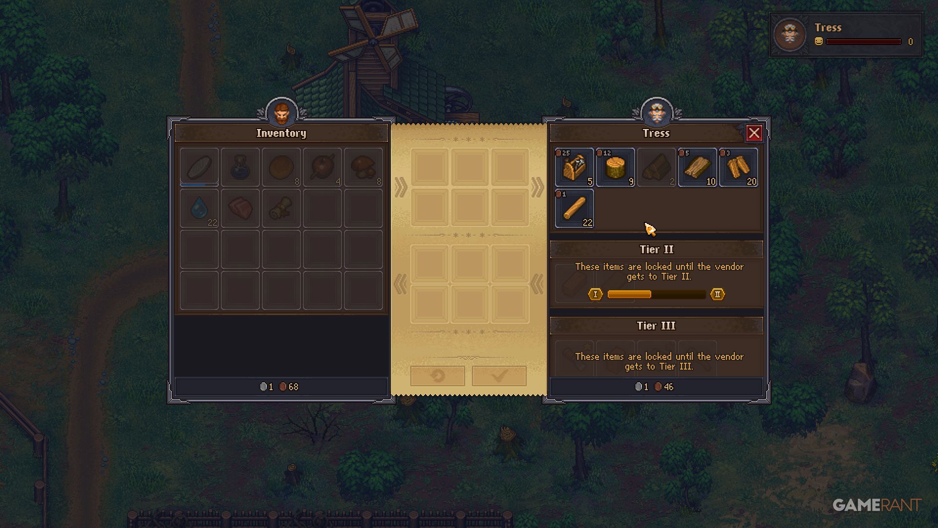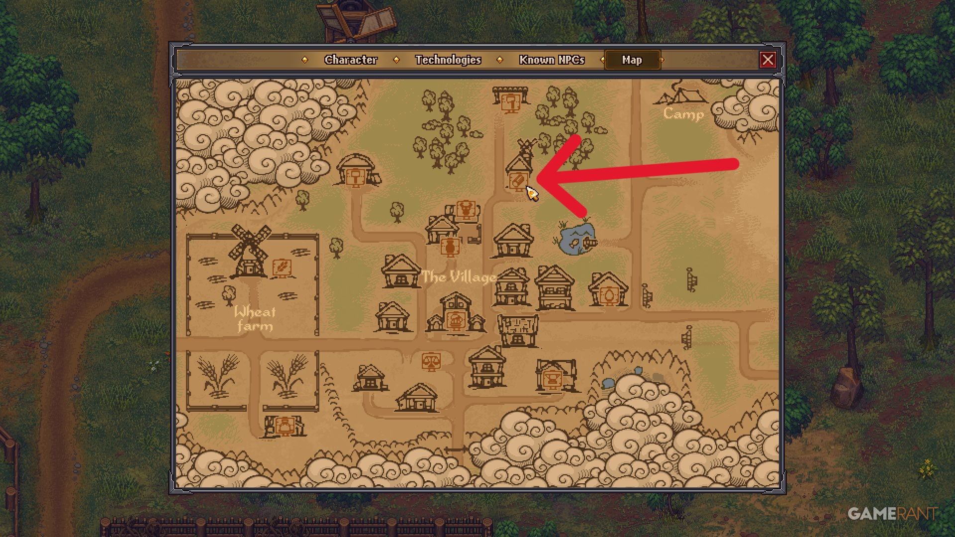 You can find Tress, the carpenter, a little northeast of the village tavern, in the northern part of town. On the map, he’s marked by a small building with a log symbol. He’s located just south of the woodcutter and sells items like Wood Repair Kits, various types of wood, and eventually better tools as you progress.