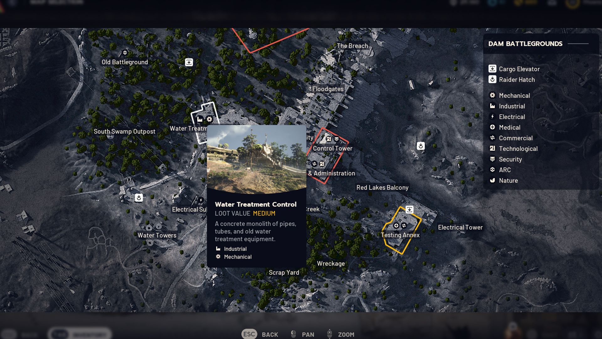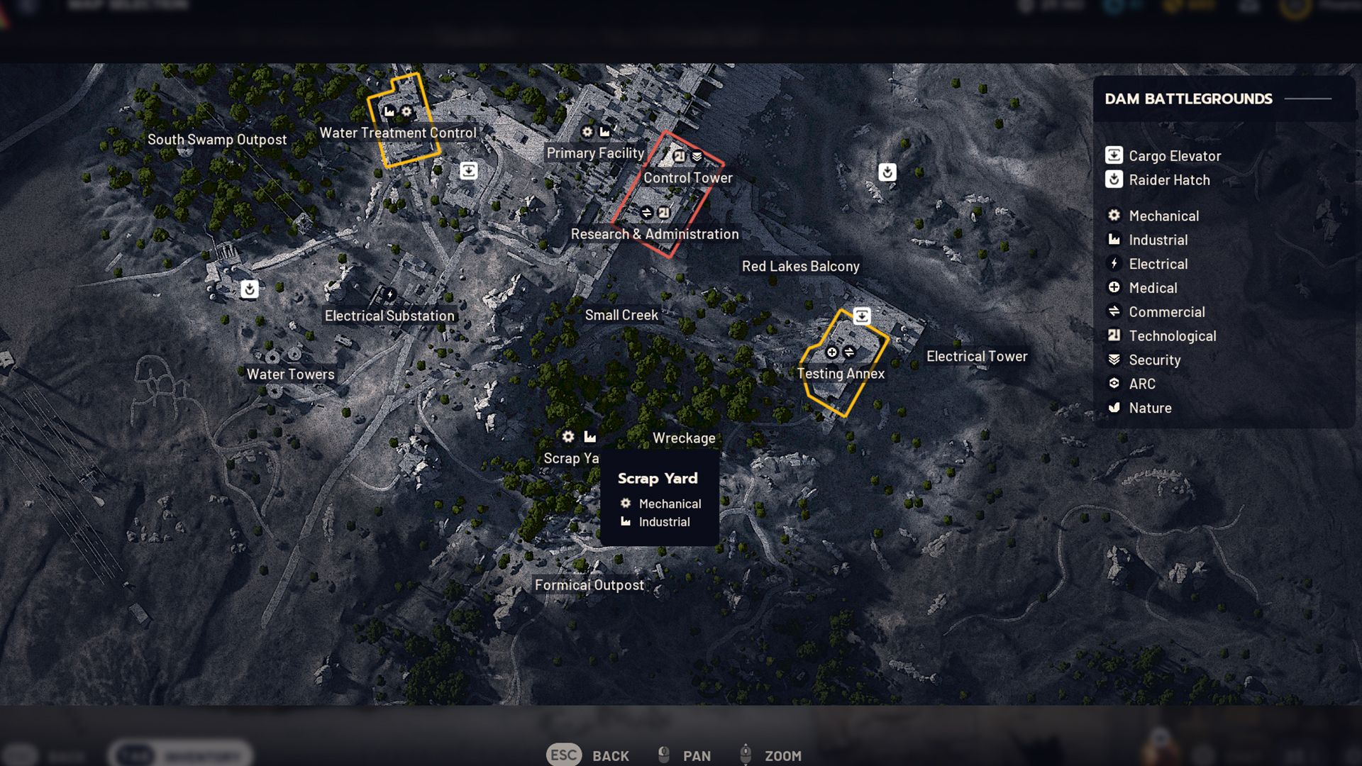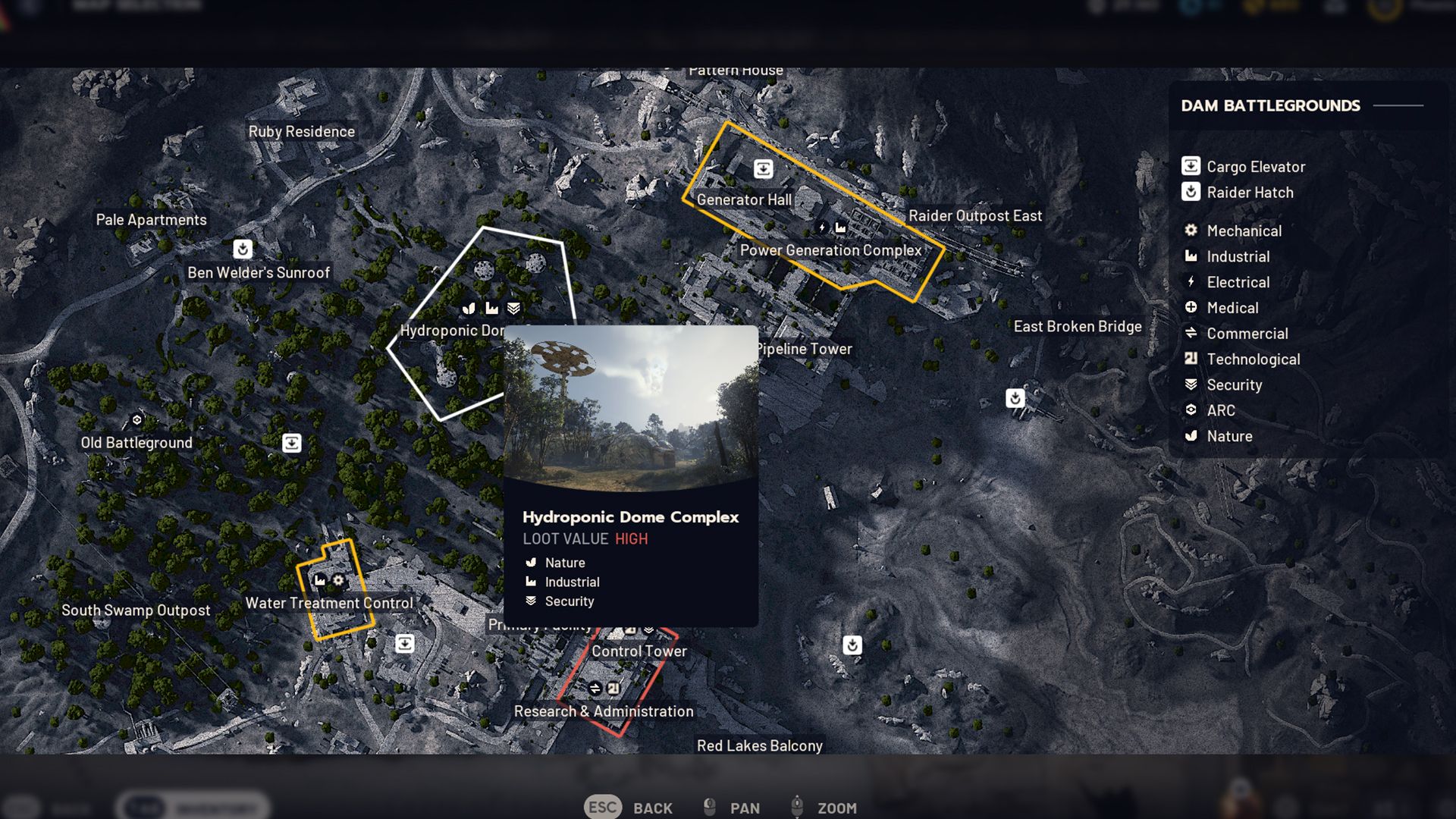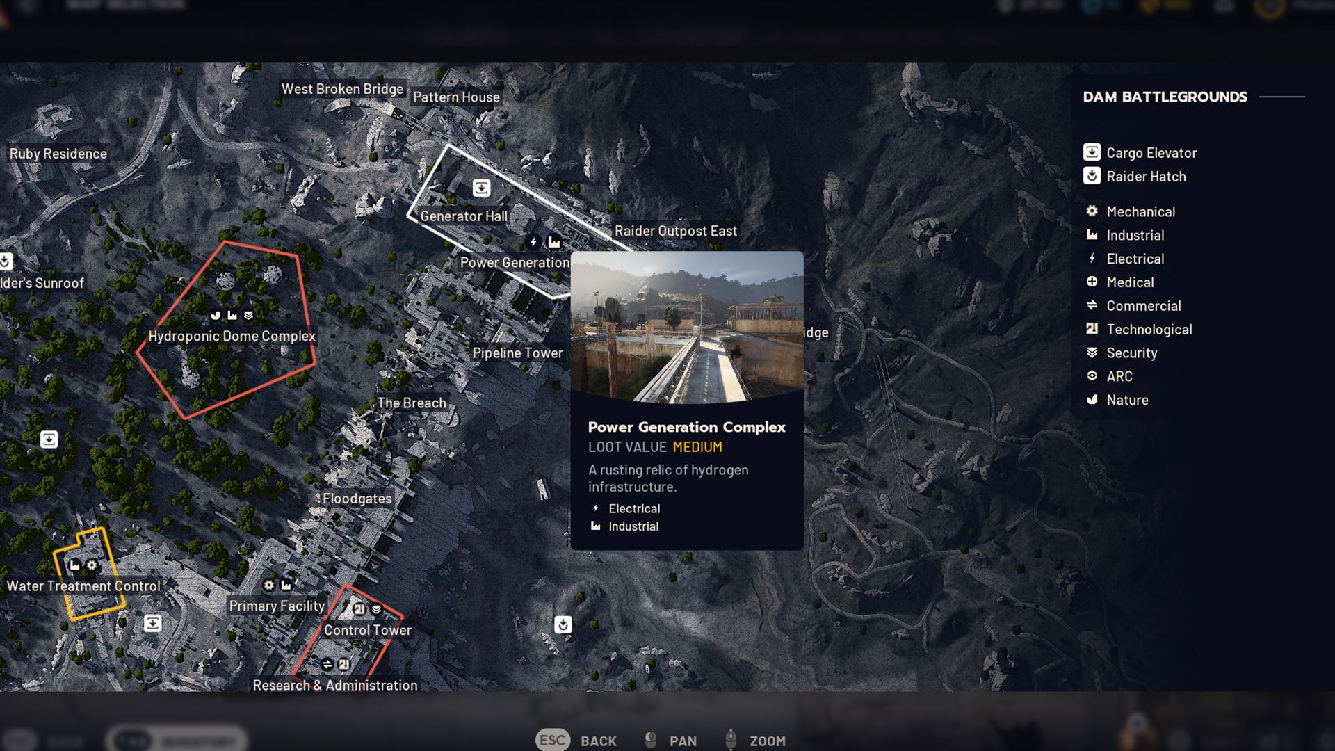 Dam Battlegrounds is well-designed because players begin raids near an Industrial marker. The northern area features the Power Generation and Hydroponic Dome Complexes, while the Scrap Yard and Water Treatment Control are located on the southern side.