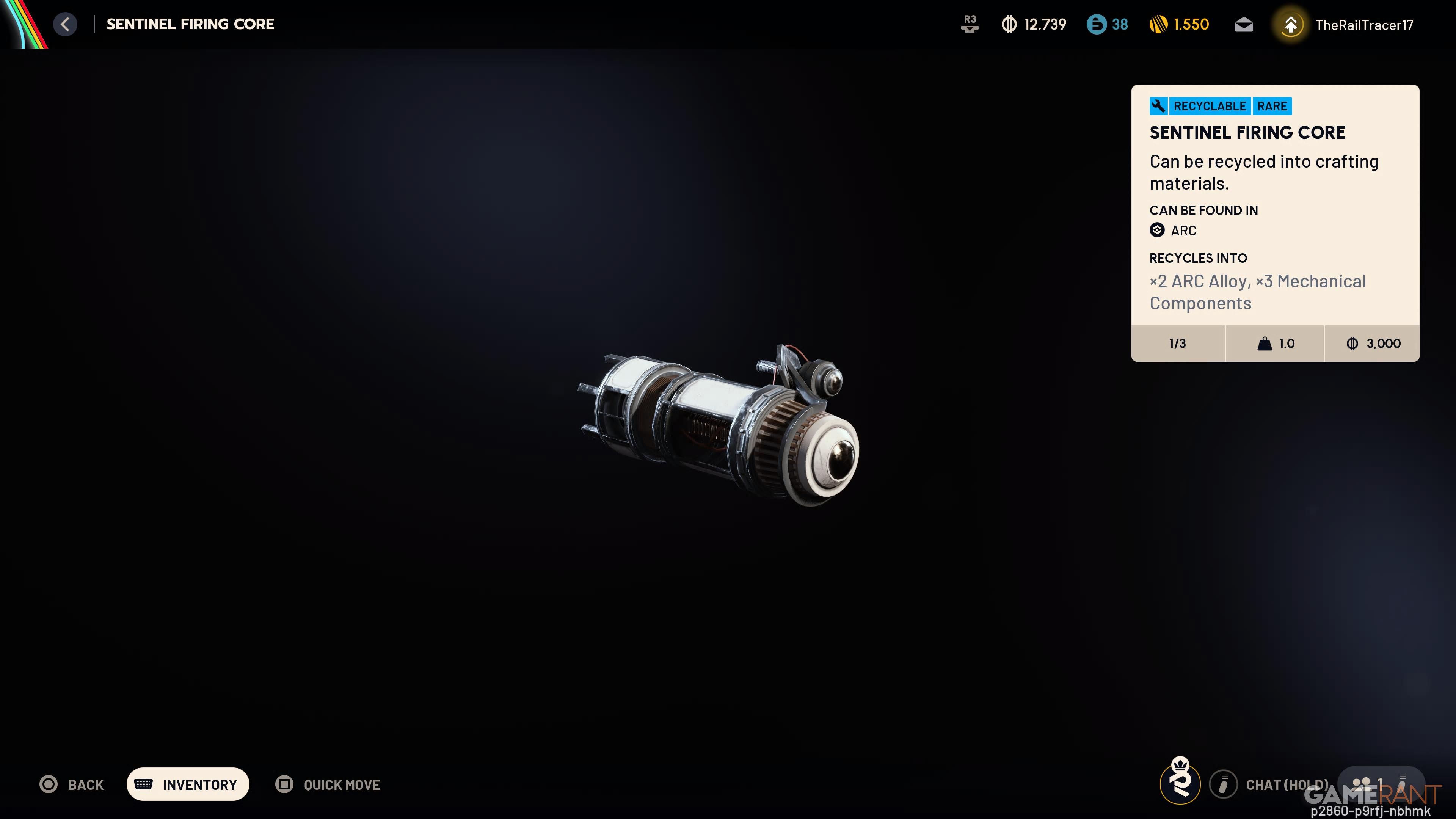 Recycling the Sentinel Firing Core gives you two ARC Alloys and three Mechanical Components, which are both helpful for crafting and improving your gear.