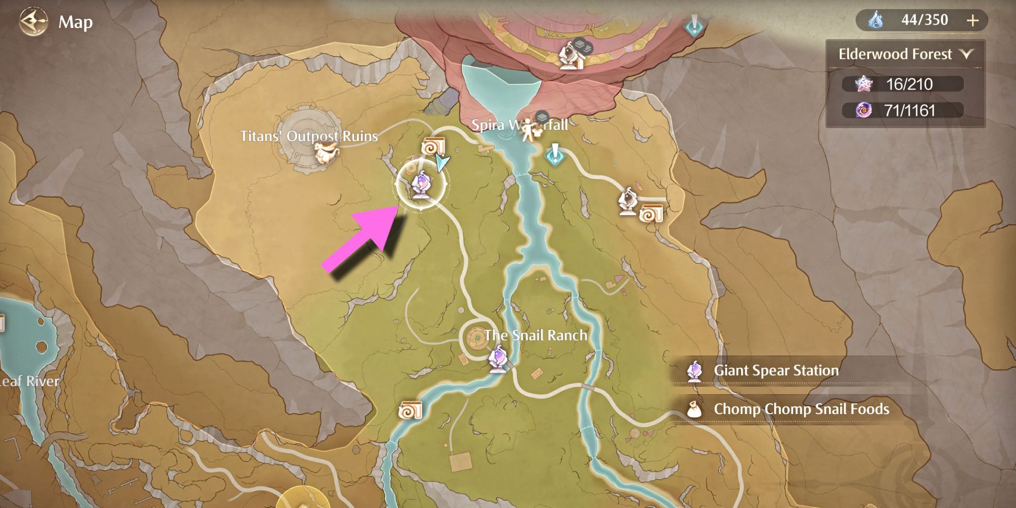 To keep your snails healthy, you’ll need to feed them Snailfruit. If a snail gets sick, use Snailcure. You can buy both of these from Babubu, who is located at Giant Spear Station, north of Elderwood Forest, near the Spira border (as shown on the map).