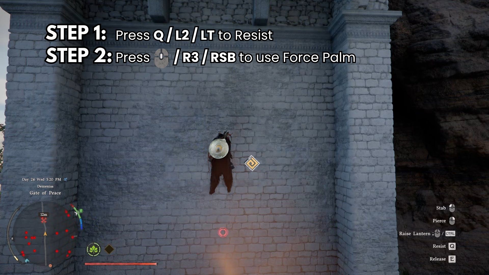 Latch onto the false wall and use Force Palm by pressing Q + Middle Mouse Button (KB/M), L2 + R3 (PS5), or LT + RSB (Xbox) to reach the hidden room.