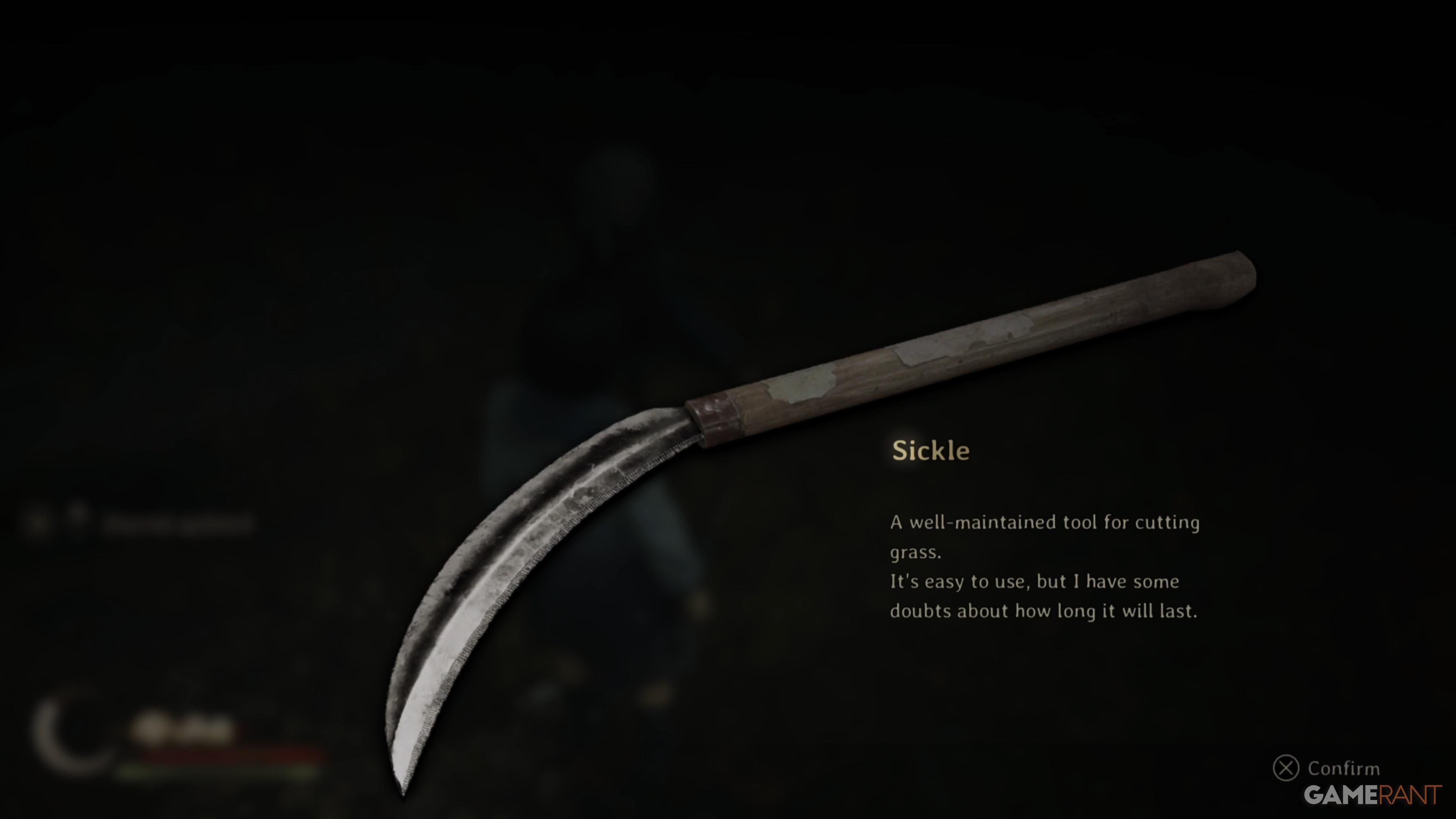 Once the scene with Shu ends, you’ll be in an empty field filled with scarecrows. Check the first scarecrow – the one with a cloth over its face – and take the Sickle from its hand. This will give you a weapon for fighting, but keep in mind it doesn’t last very long.