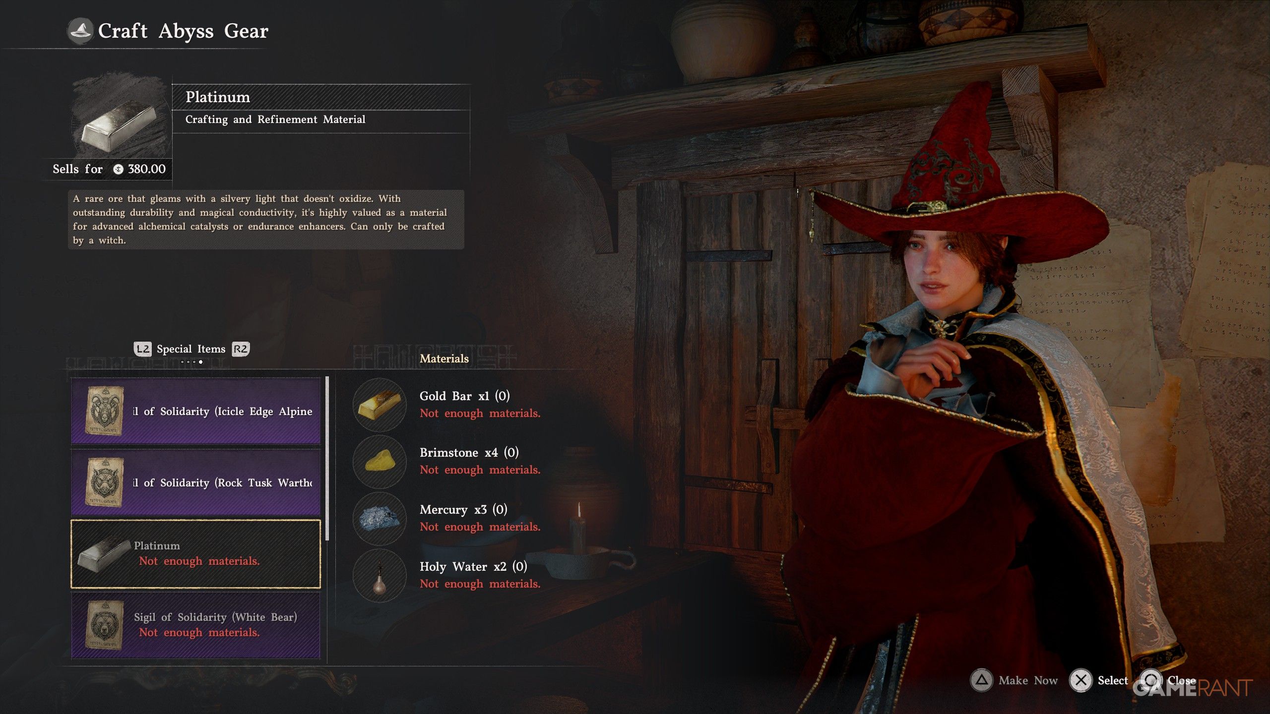 - Select “Craft Abyss Gear” and press R2/RT to reach the “Special Items” tab. You will need the following items to craft the Platinum: