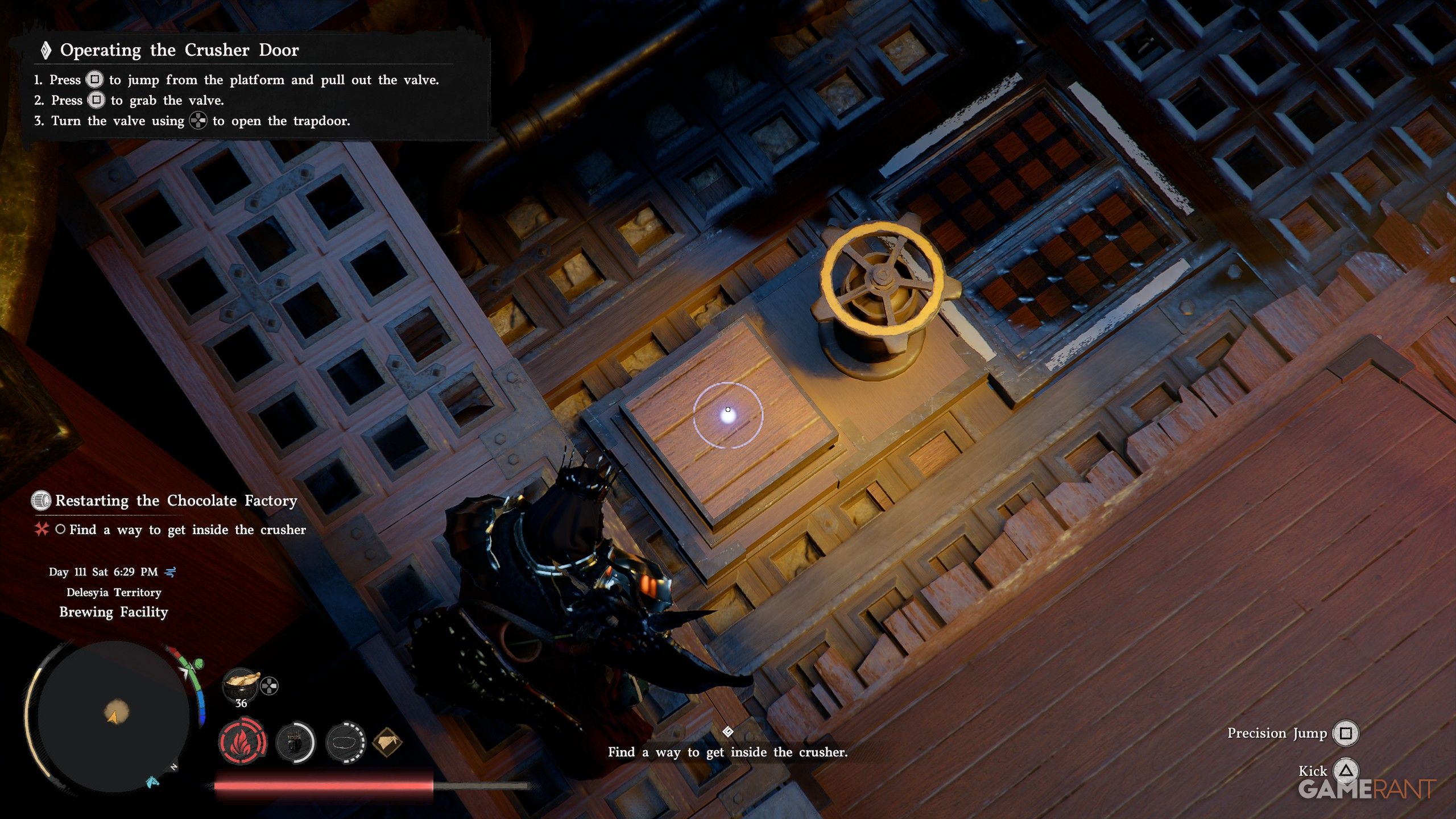 - Opposite the handwheel is a wooden pressure plate, so stand on it and jump repeatedly to raise the valve.