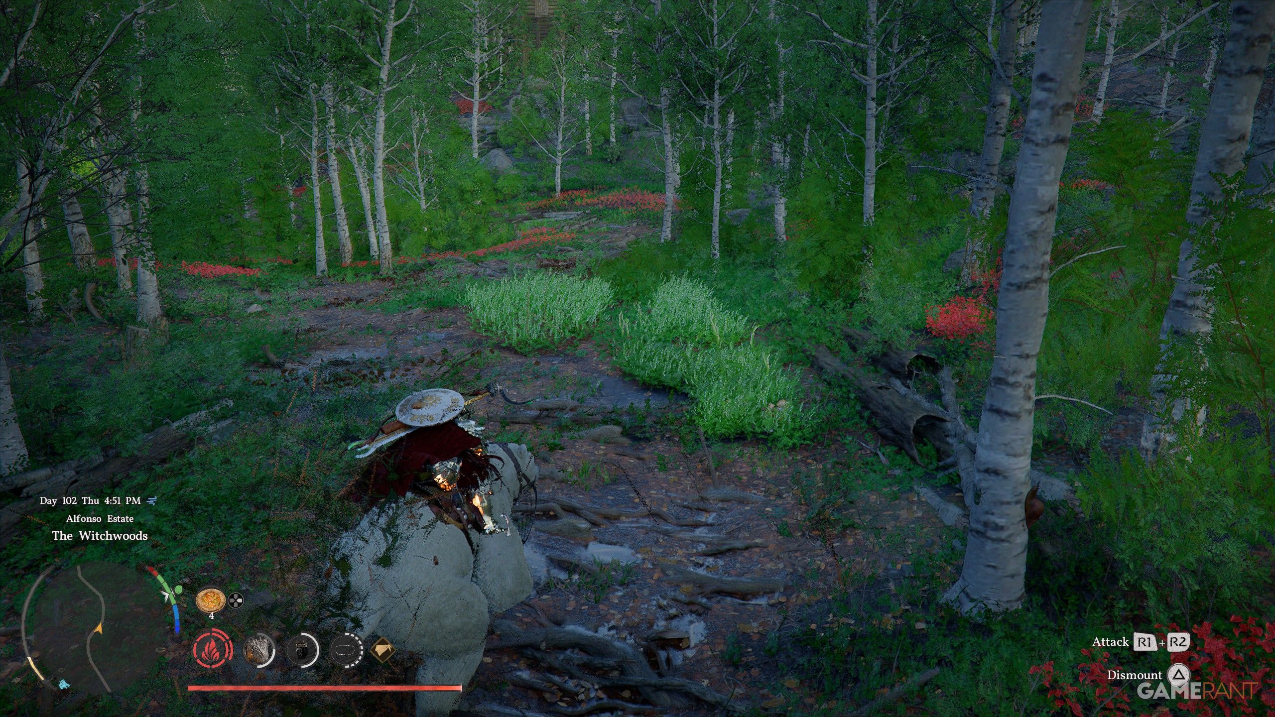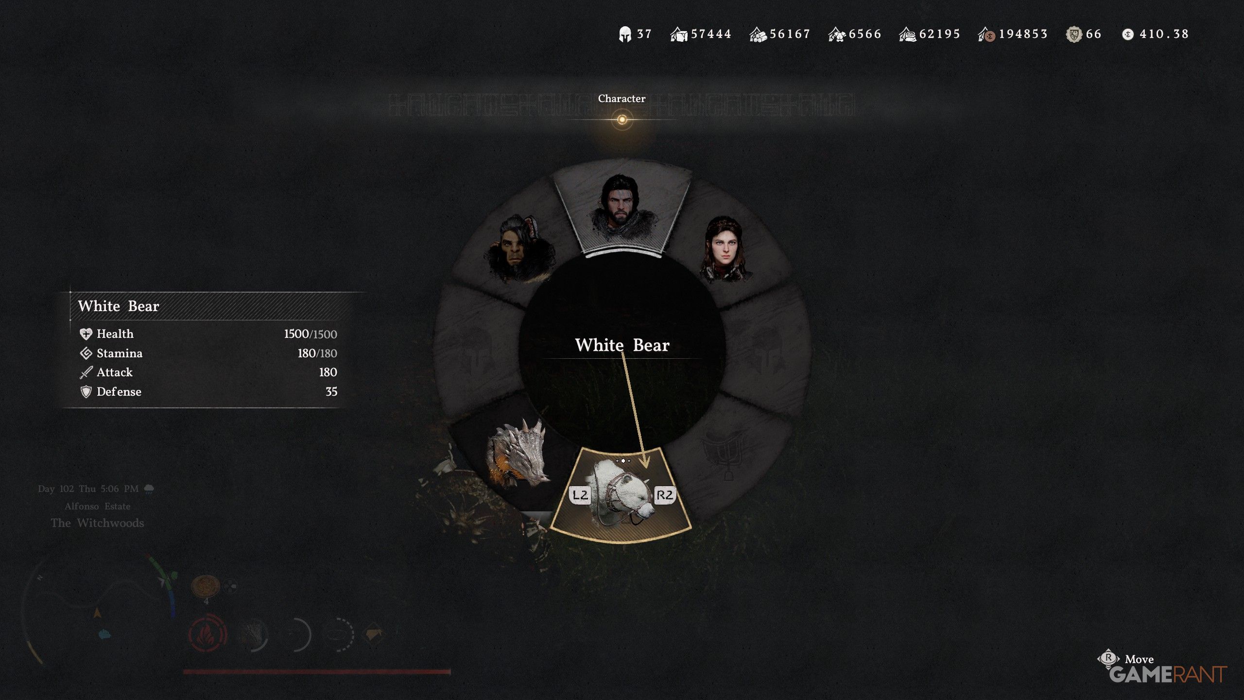 - Hold Down on the D-Pad and use the Right Stick on the Character Wheel to highlight the horse, then press R2 to flick through your mounts and release when you’re on the White Bear.