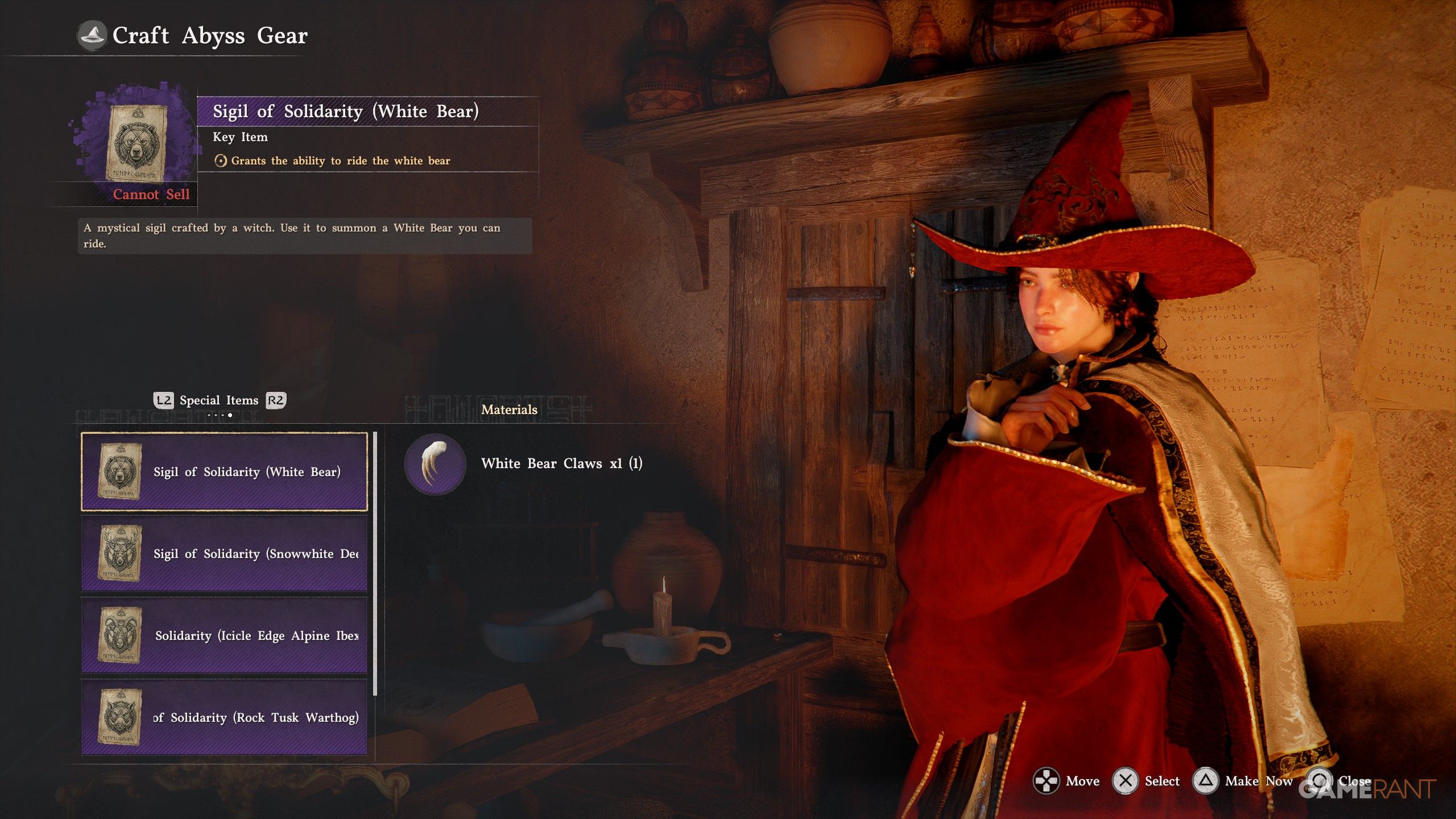 - Press R2/RT to scroll to “Special Item” and craft “Sigil of Solidarity (White Bear)”.