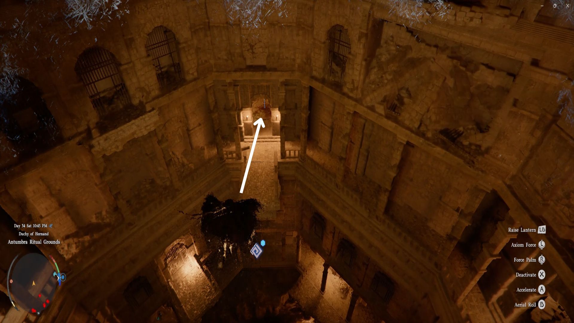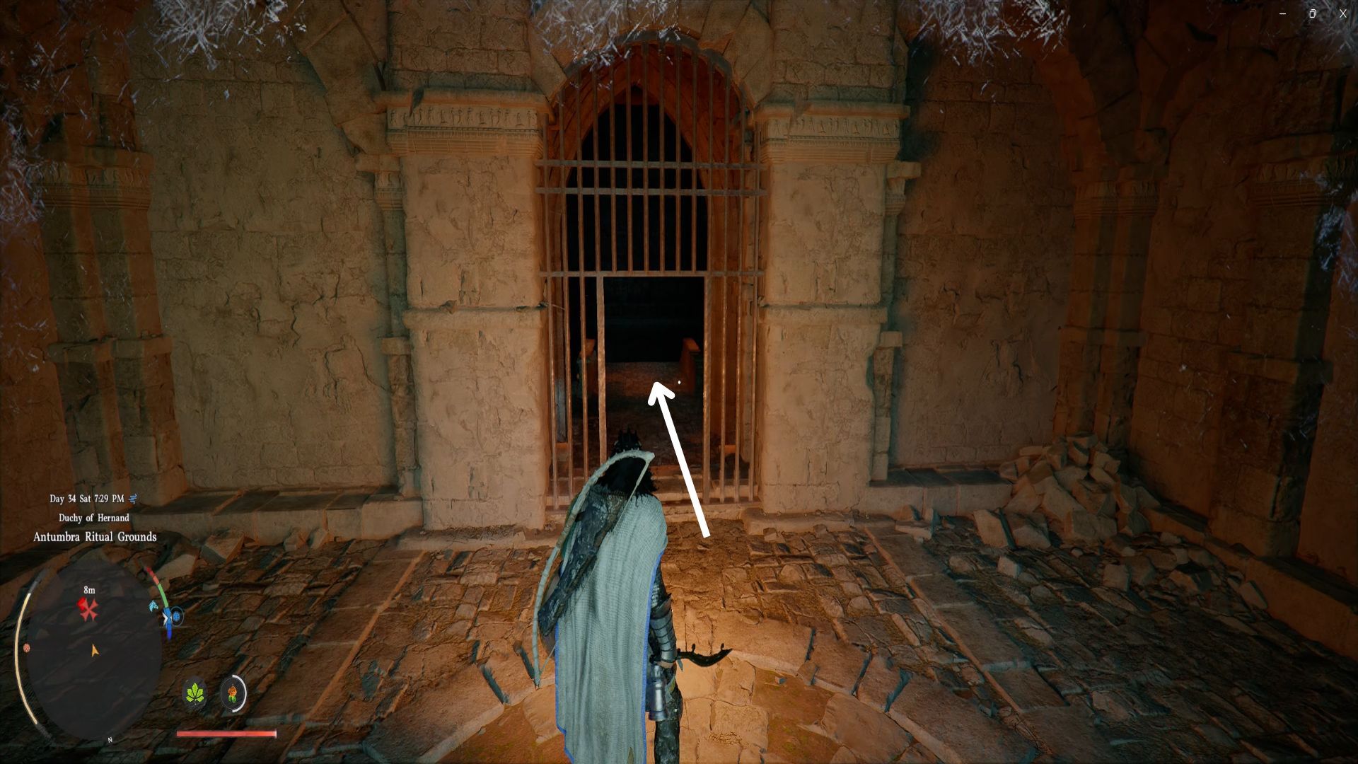 The arrow in the image points to the entrance of the Antumbra Ritual Grounds, where you can find the Soul Spear. To make sure you’re in the correct location, look for the stone bridge on the right side.