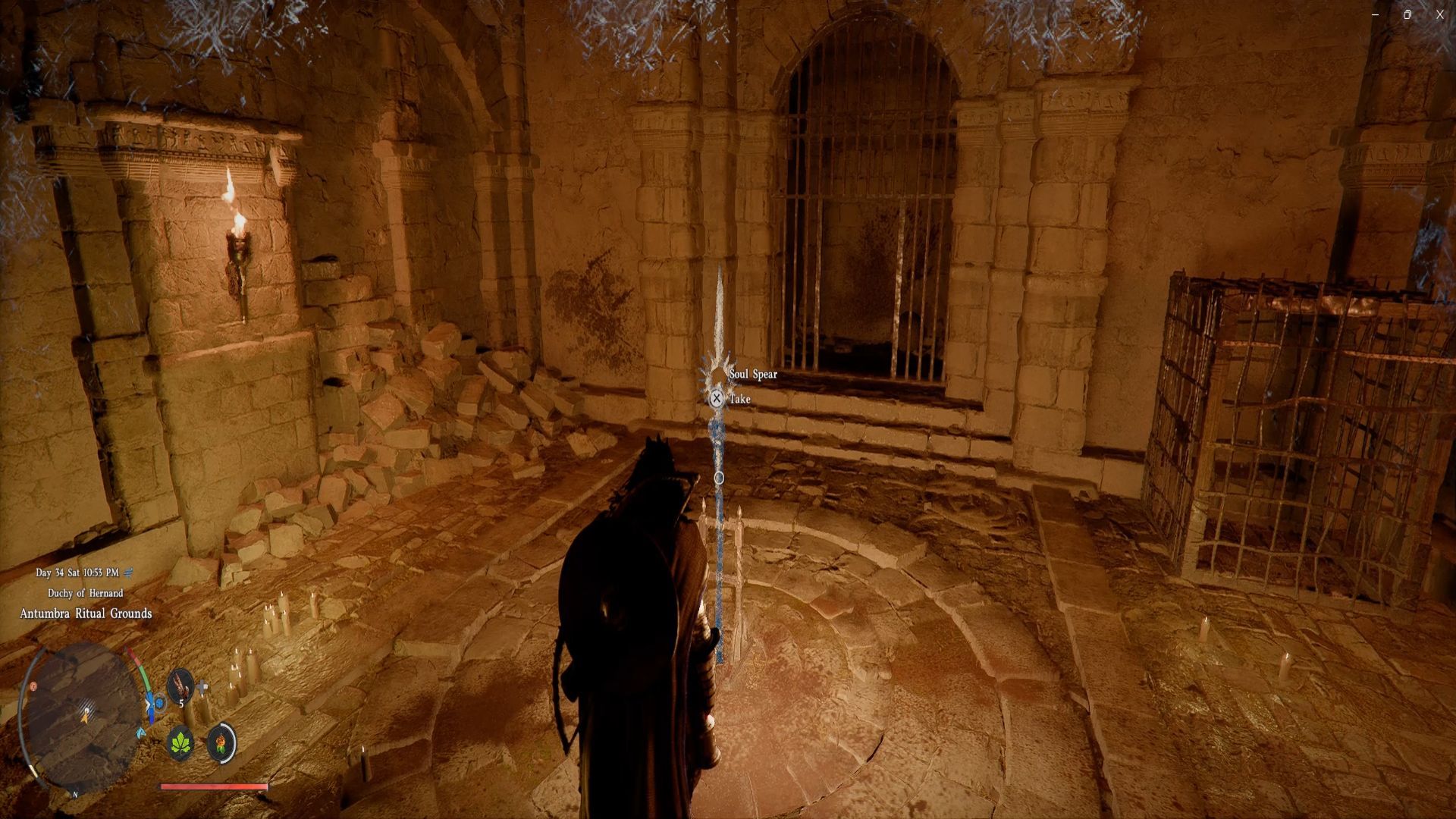 The arrow in the image shows you the exact location of the Soul Spear. You’ll need to go down four levels and land on the platform that’s on the south side of the ritual grounds.