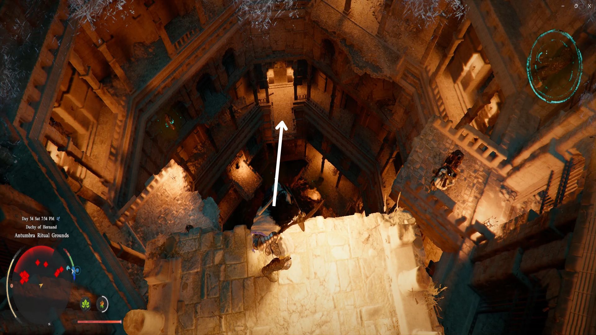 After entering, go through the doorway and continue straight ahead. You’ll soon reach the remains of a bridge, offering a view down into the ritual grounds.
