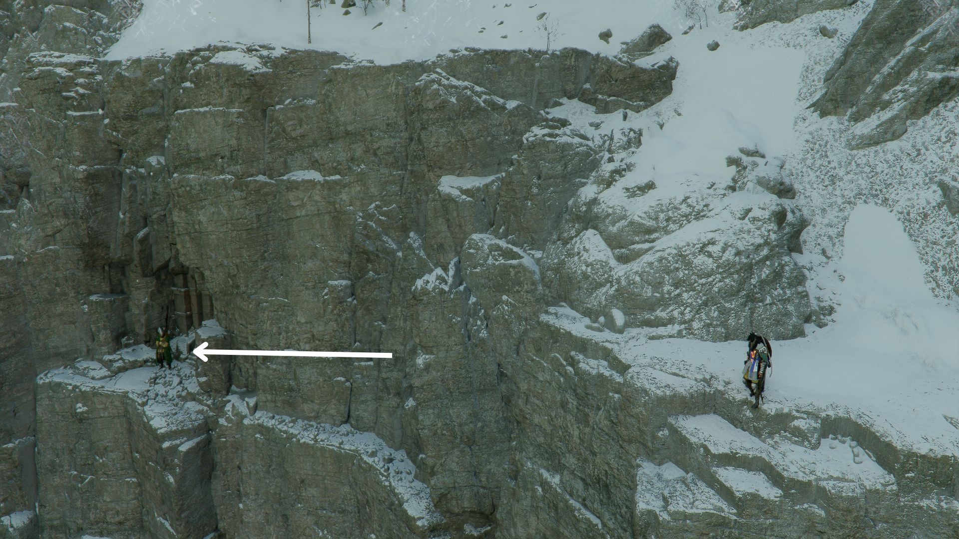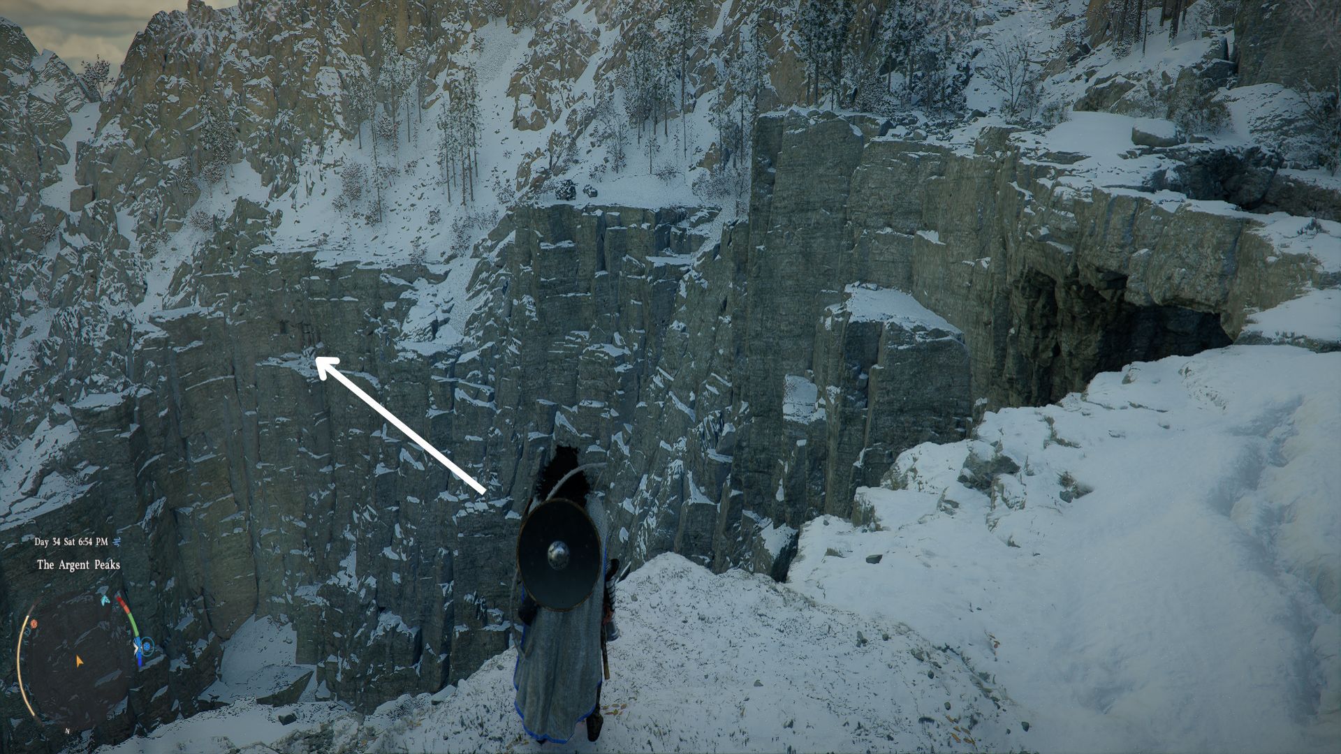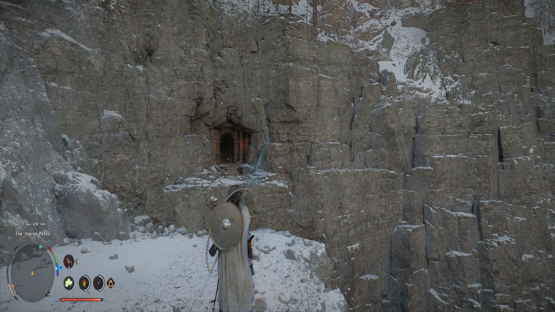 The entrance is hidden on the mountainside, requiring you to either climb down or fly to reach it. Checking it out with photo mode, as shown in the image, can help you figure out the best way to get there.