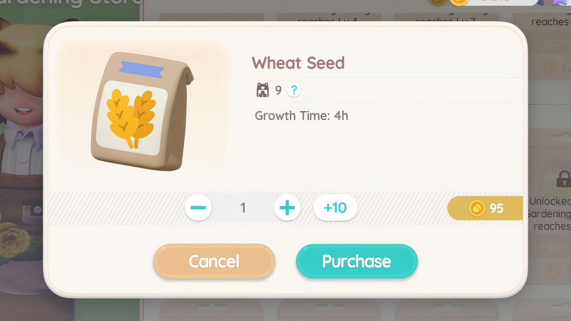 Wheat seeds cost 95 Gold each and you need to be at least Gardening Level 2 to plant them. After planting, it takes 4 hours for wheat to grow. Because of the long growth time, using a fertilizer like Growth Booster is a great idea to speed things up.