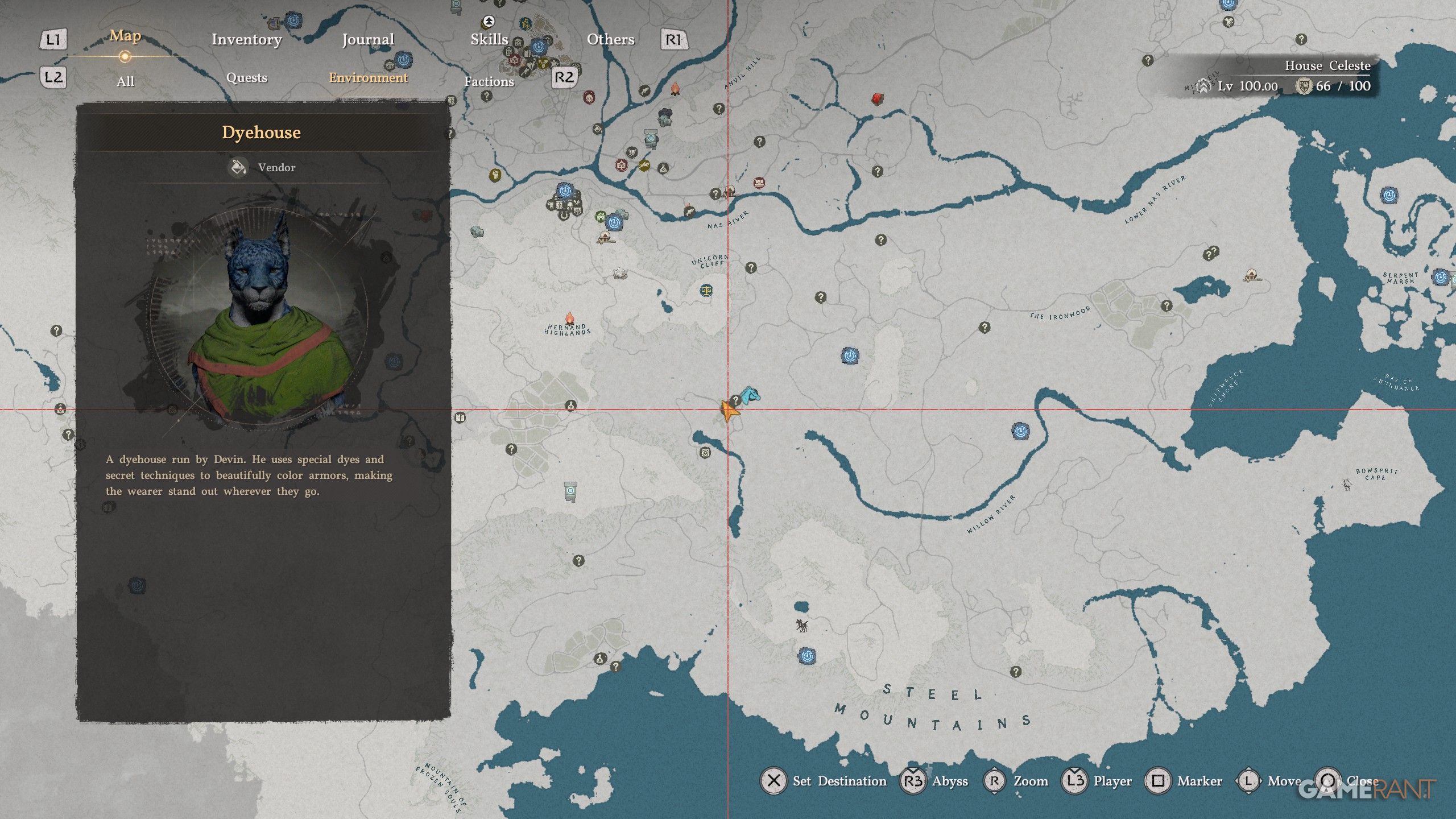 - To unlock these dyes to be used across all Dyehouses, you must talk to Devin, located in Pororin (marked on the map above).