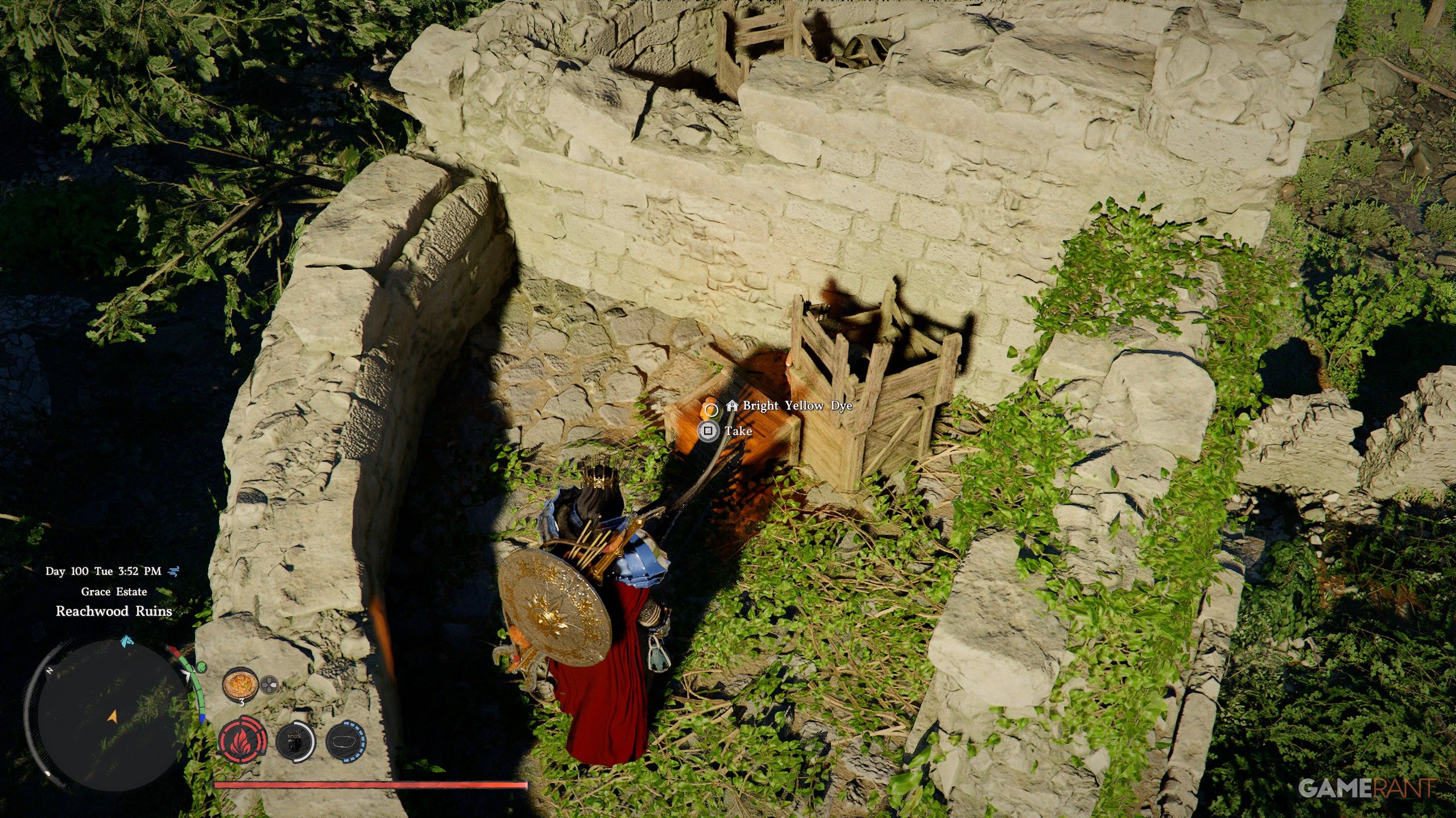 - On a wooden box on the roof, you can pick up the Bright Yellow Dye.