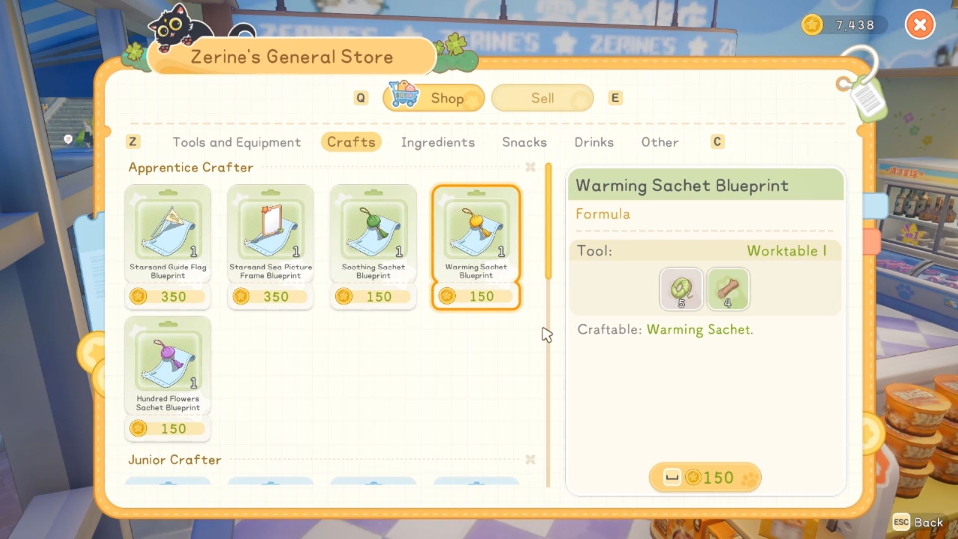 The Warming Sachet blueprint costs 150 Gold at Zerine’s shop, but you’ll need to become an Apprentice Crafter before it appears as an option. Keep doing quests for Zerine and Solara to level up your crafting skill and unlock the blueprint.
