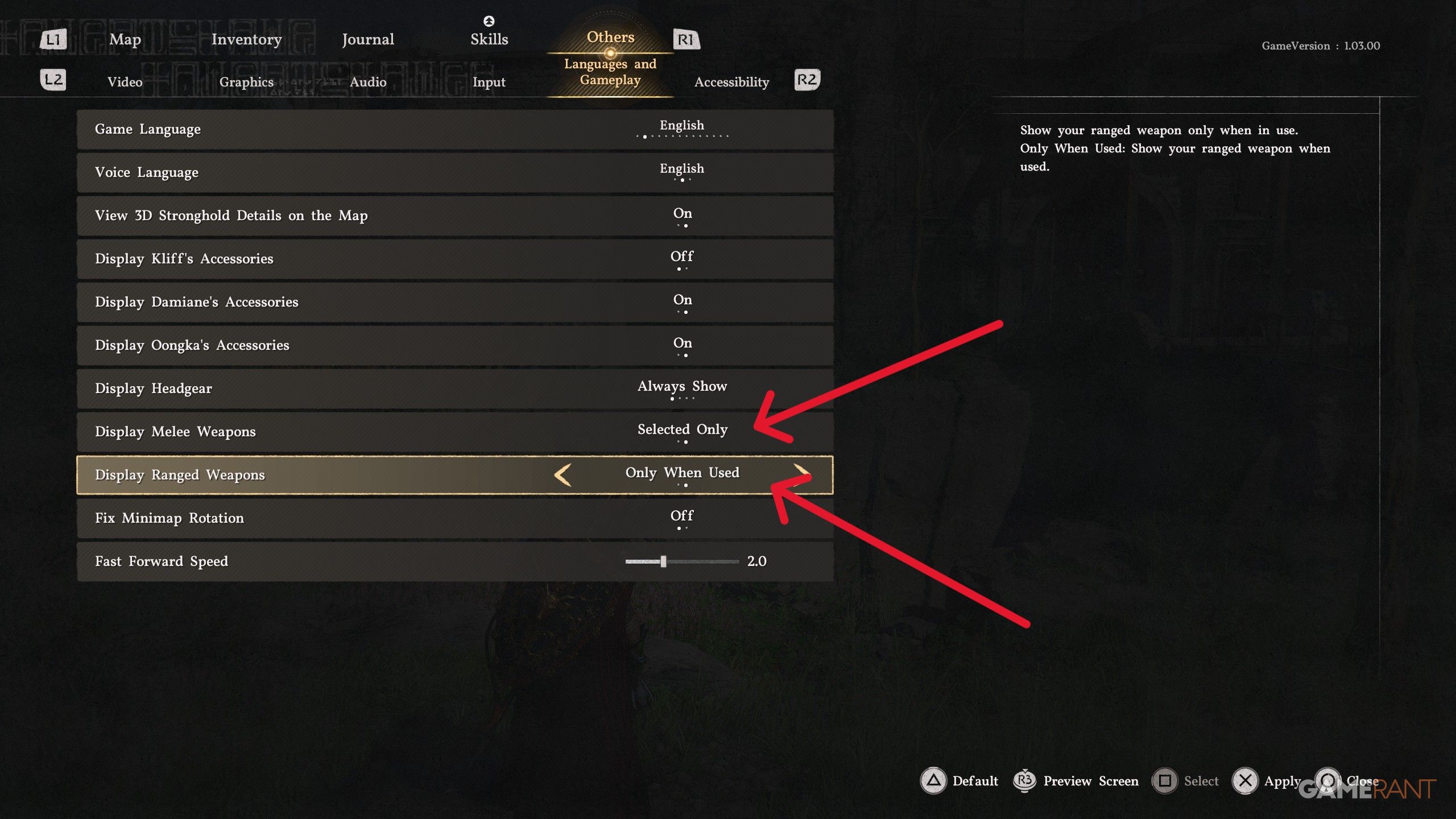 - Navigate to the “Languages and Gameplay” tab to find the “Display Melee Weapons” and “Display Ranged Weapons” sections.