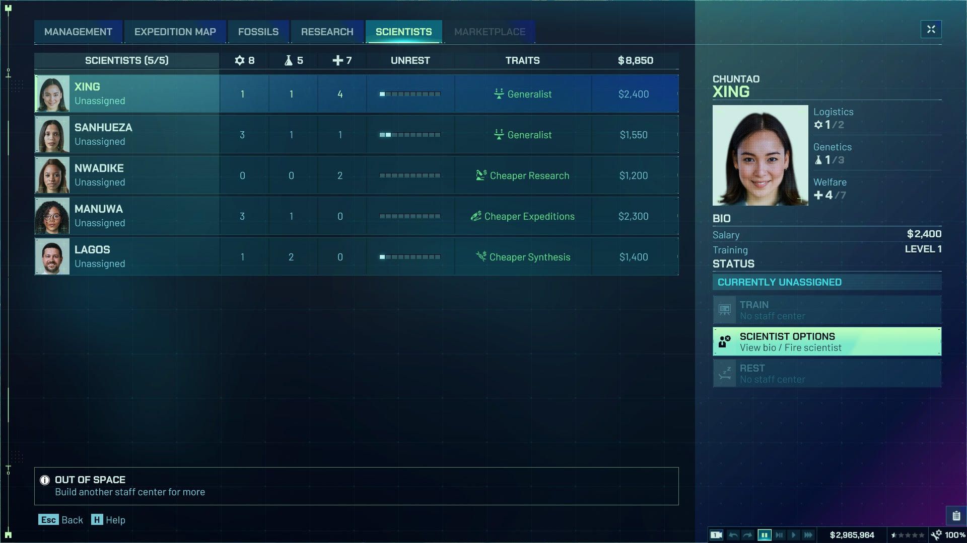 After setting everything up, go to the Control Center and choose “Recruit Scientists.” You’ll see a list of potential candidates, each with unique skills, areas of expertise, and salary expectations. Each scientist has their own strengths, skill levels, and ability to improve, all of which impact their performance.