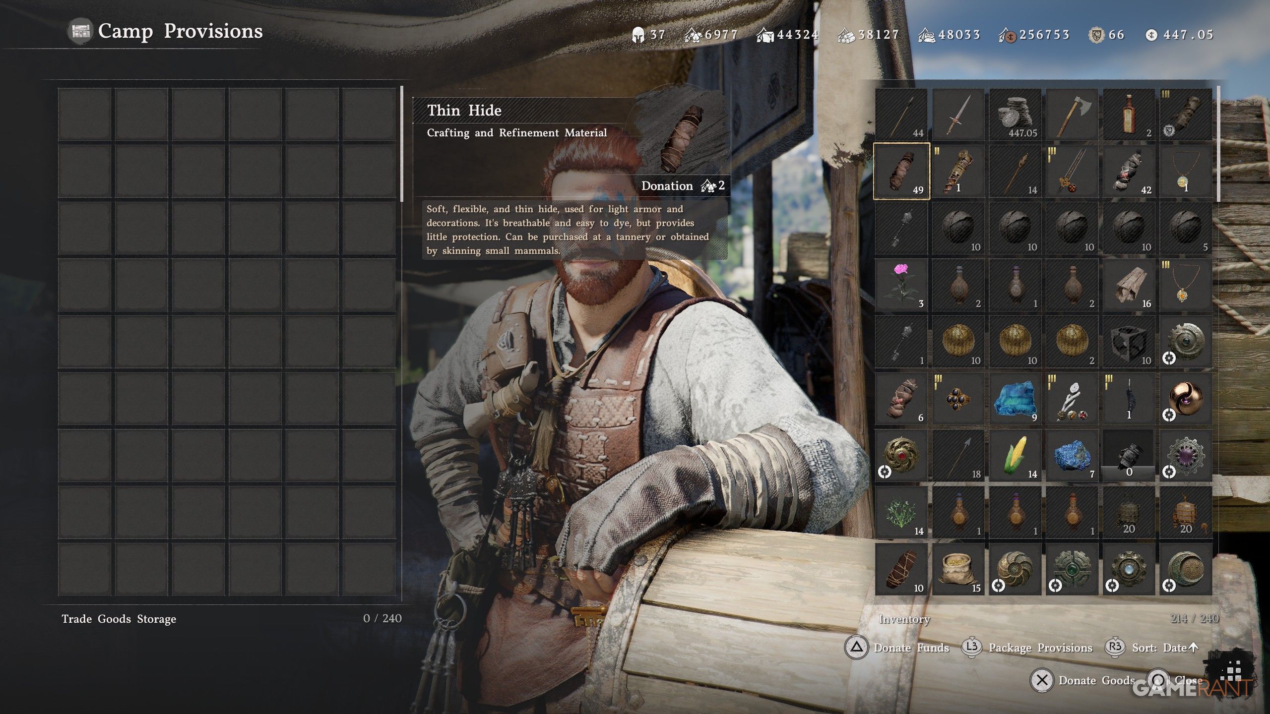 - You can donate Wool, Hide, Abyss Gears, Weapons, Armor, and more to get Camp Armor/Weapons added to your total funds.