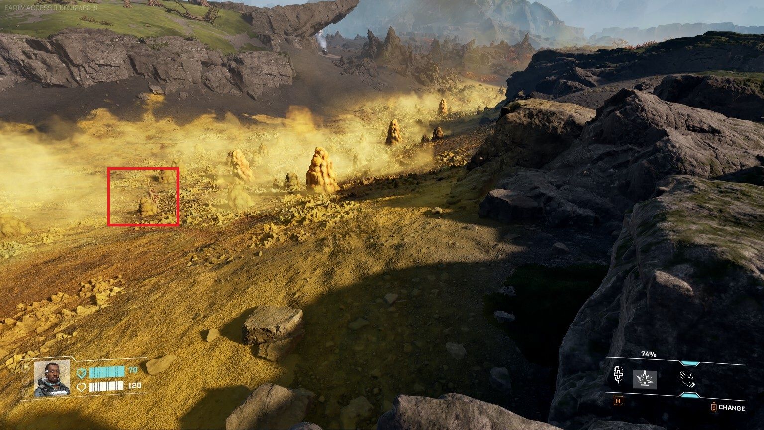 Sulhearts live close to sulfur deposits on the planet Arcadia-7. You can spot these deposits by looking for large areas of yellow ground where gas is venting. If you’ve found one before, it will be highlighted in bright yellow on your map. The challenge with collecting Sulhearts is that they appear in the harmful, corrosive gas around these deposits. You’ll need to quickly run in, grab the Sulhearts, and get out before the gas damages you.