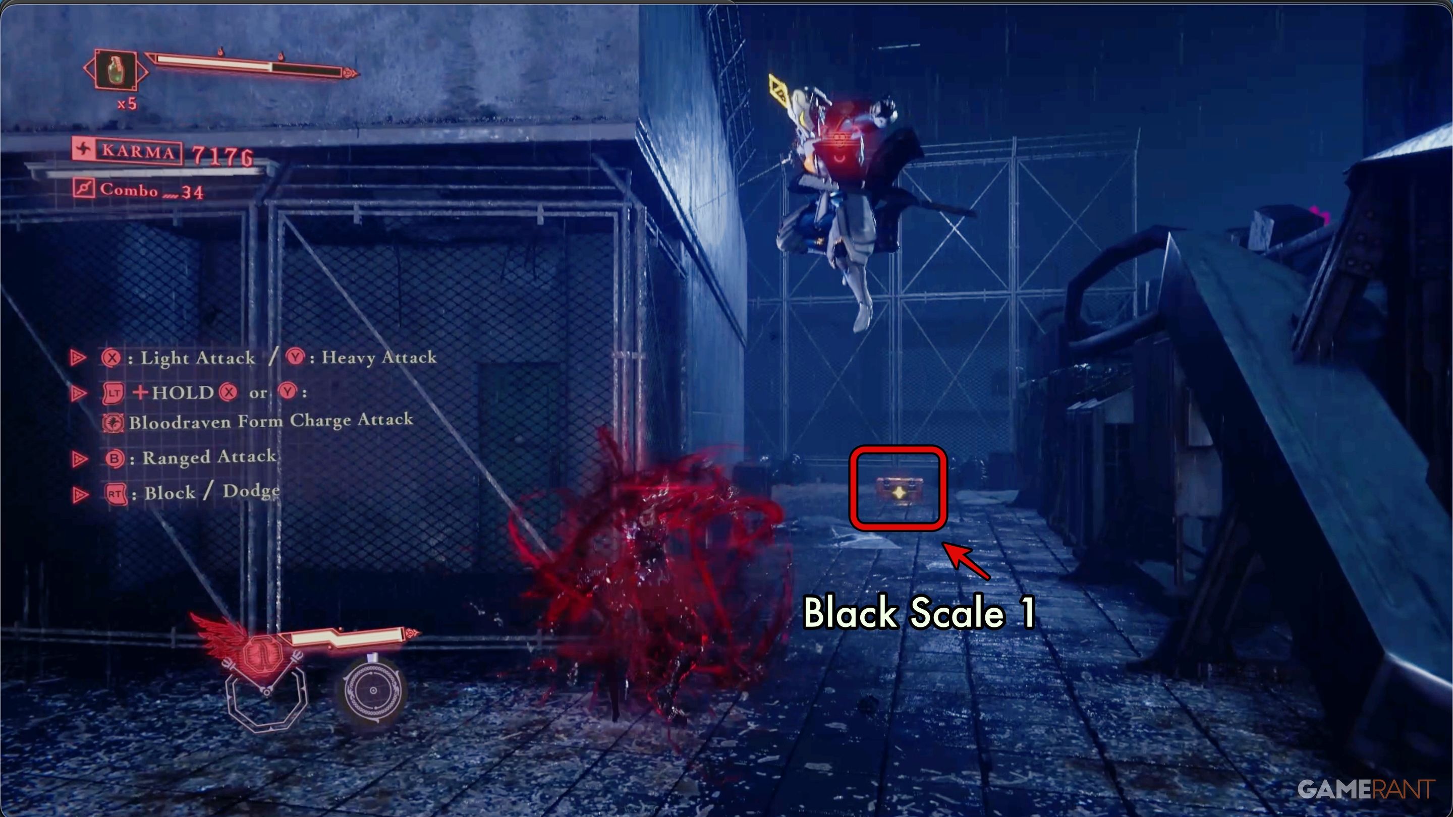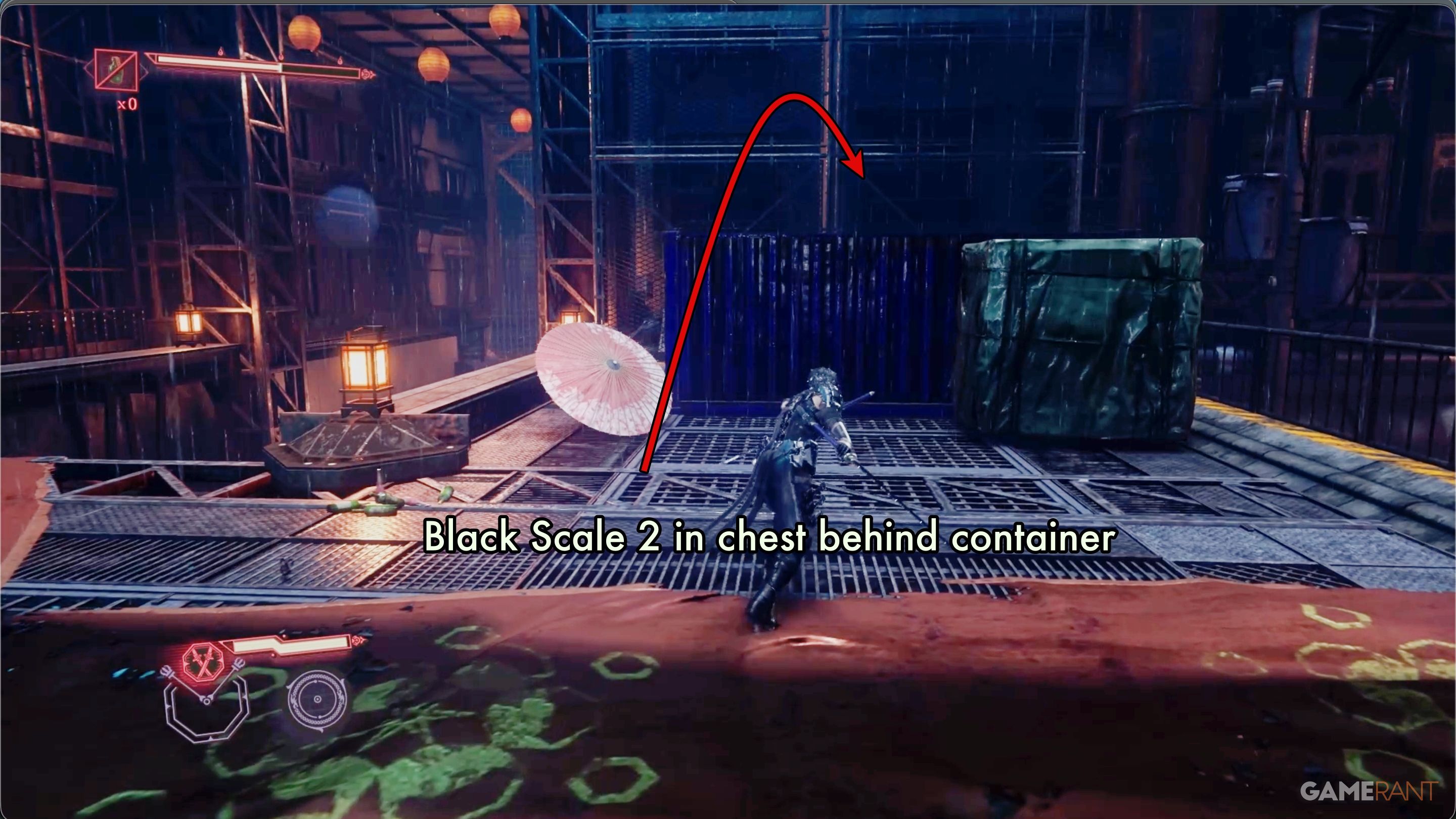 Black Scale 1 | Chapter 2: After making your way up the rooftop steps with floating drones, you’ll face an elite enemy before jumping on a yellow rail. The first Black Scale is in a chest at the end of the short alley to the left if you are facing the elite enemy head-on. |