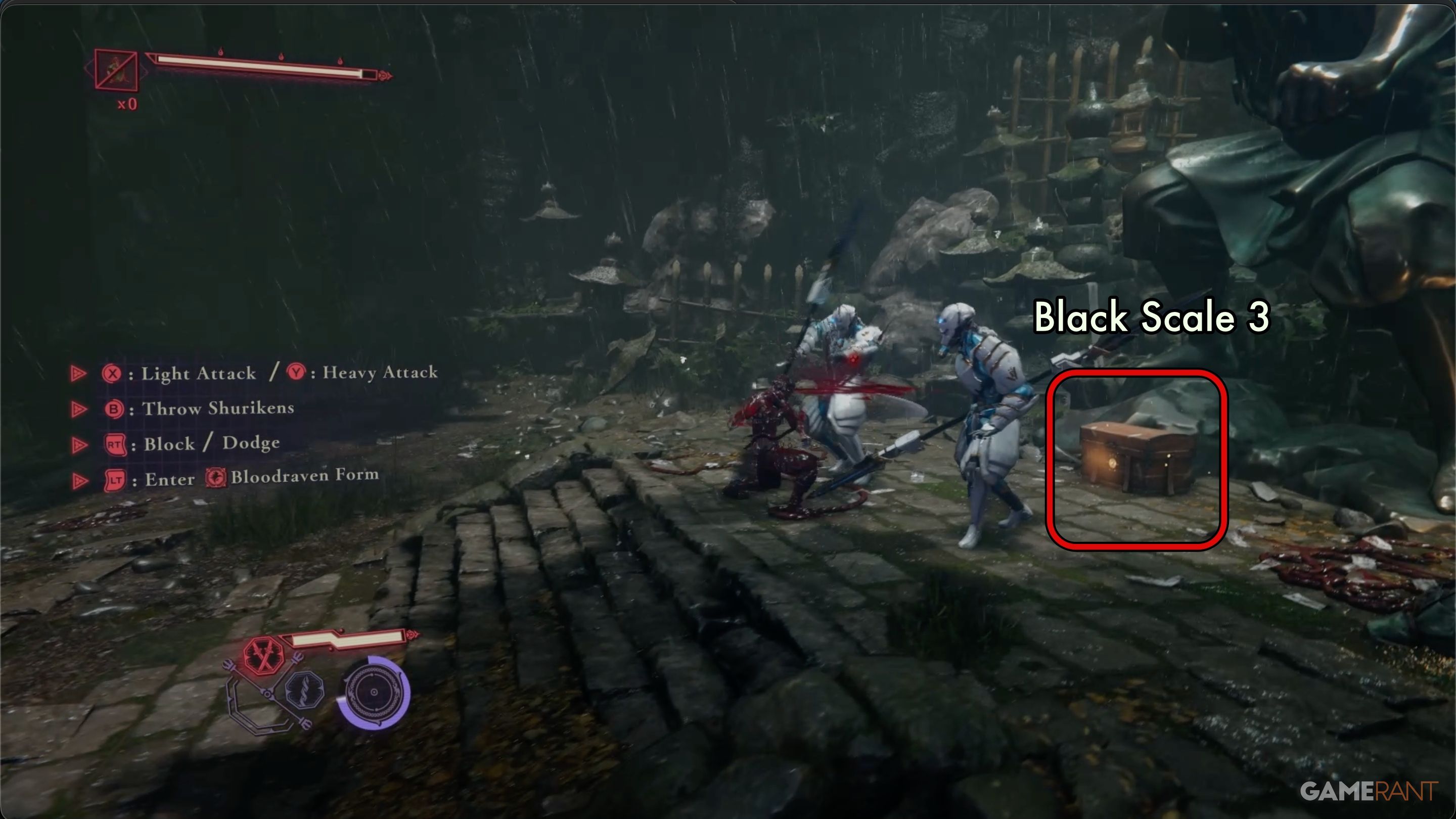 Black Scale 3 | Chapter 4: While fighting through the chapter, you’ll find a chest at the top of a set of stairs, guarded by two spear-wielding enemies. The scale is in the chest. The area appears to be a shrine or memorial of some kind, and as such it’s hard to miss. |