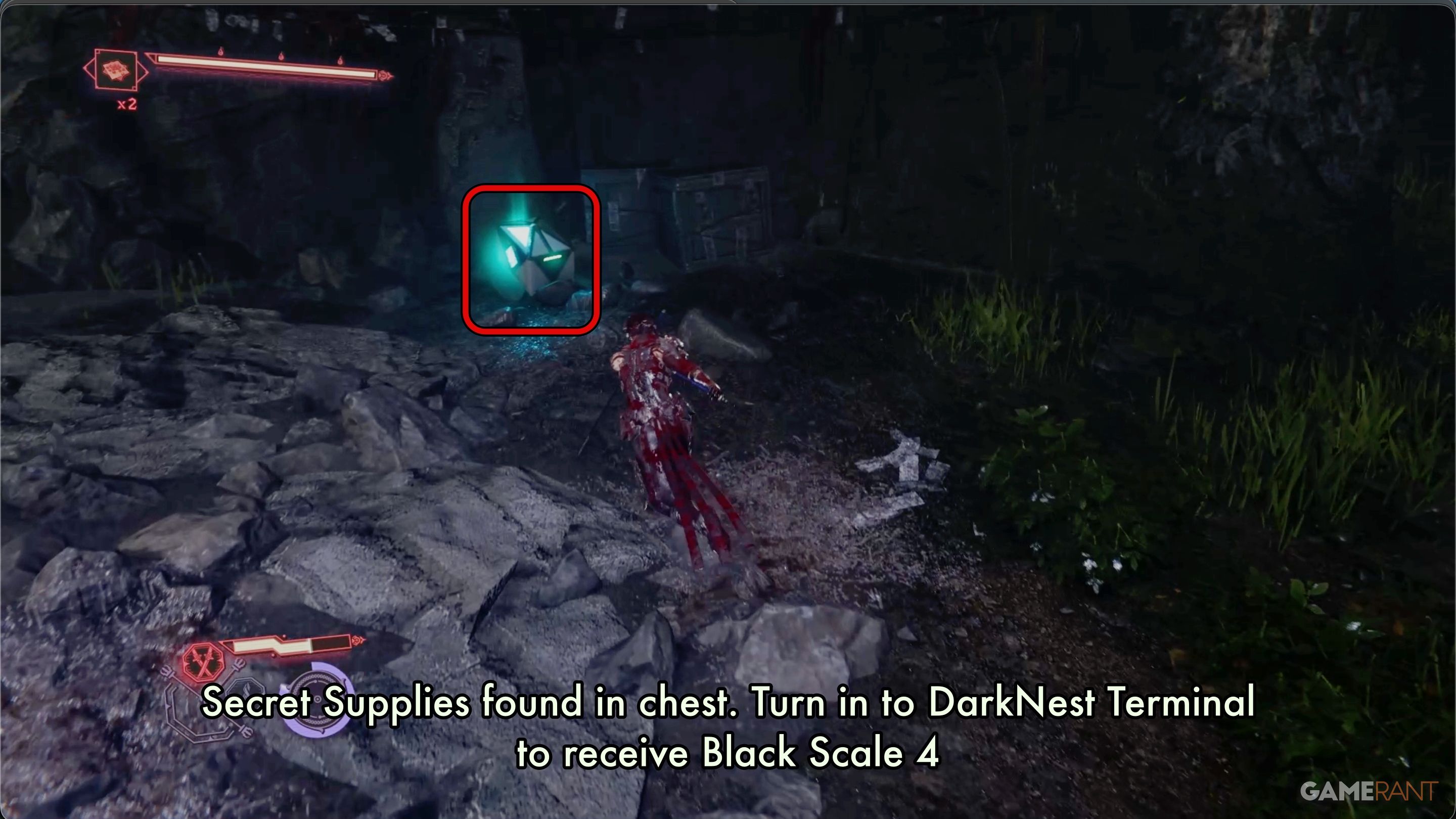 Black Scale 4 | Chapter 4: Complete the ‘Secret Supplies’ mission. You can find the supplies in a special high-tech chest that has a unique glow. It is found in a large clearing where the wreckage of a high-tech flying machine is encountered. There are several chests in the area, but the secret supplies stand out. |