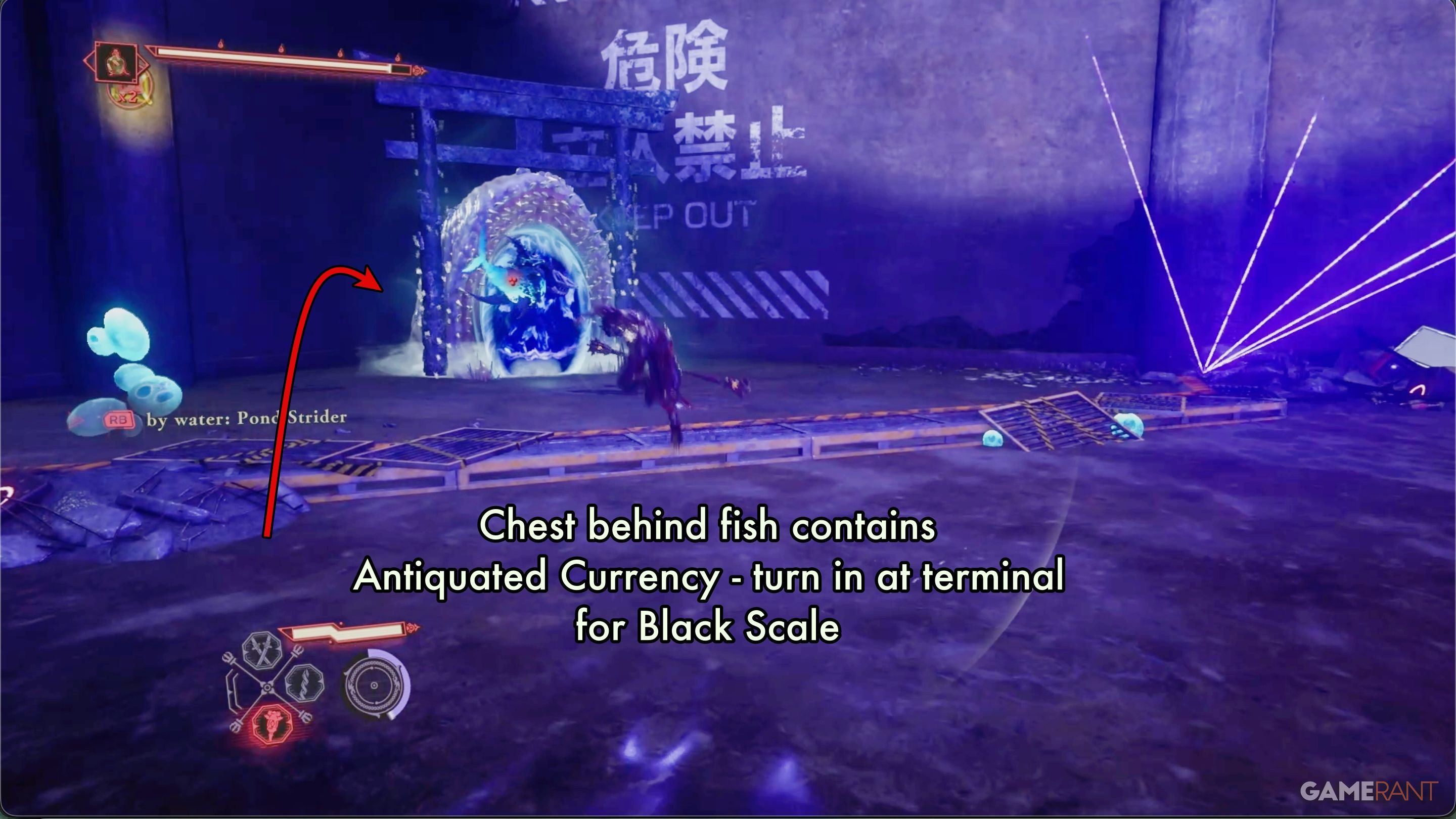 Black Scale 6 | Chapter 9: In this chapter, you’ll encounter open areas that you can navigate with the Pond Strider. After clearing the first open area, slide under the gate into the second open area. In the second area, you’ll find a water channel that leads you back to an area similar to the Purgatory location in the first open area. There are several tough enemies here, and the Black Scale can be found in a chest in the middle of the land mass. |